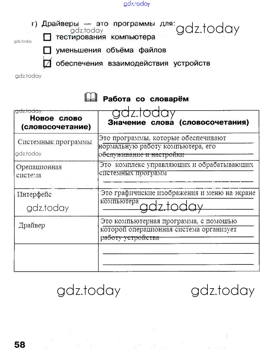 На страницах сайта gdz.today вы найдете учебный и вспомогательный материал, направленный на улучшения знаний школьной программы. ГДЗ - онлайн мир знаний Решение к части 2. Страницы 58 Рабочей тетради по Информатике для 3 класса Матвеева, Челак Бином 2017