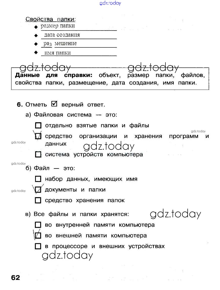 На страницах сайта gdz.today вы найдете учебный и вспомогательный материал, направленный на улучшения знаний школьной программы. ГДЗ - онлайн мир знаний Решение к части 2. Страницы 62 Рабочей тетради по Информатике для 3 класса Матвеева, Челак Бином 2017