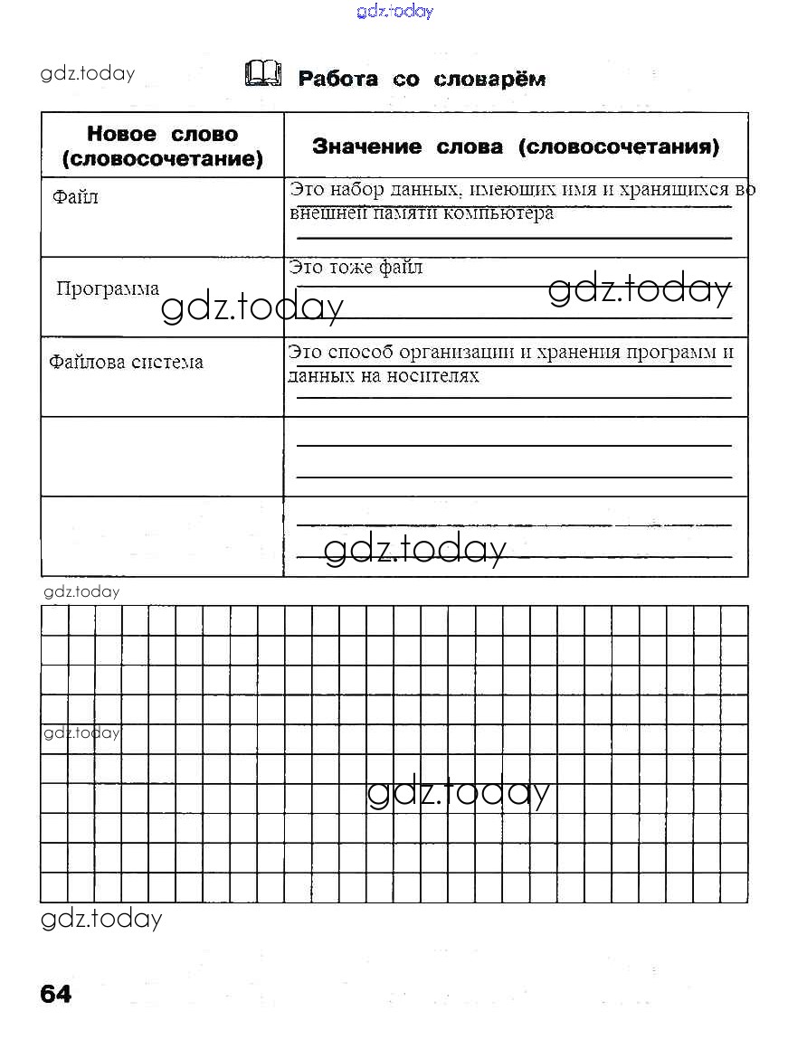 На страницах сайта gdz.today вы найдете учебный и вспомогательный материал, направленный на улучшения знаний школьной программы. ГДЗ - онлайн мир знаний Решение к части 2. Страницы 64 Рабочей тетради по Информатике для 3 класса Матвеева, Челак Бином 2017