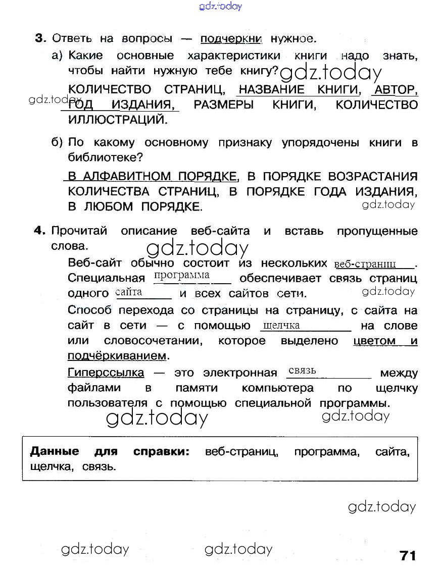 На страницах сайта gdz.today вы найдете учебный и вспомогательный материал, направленный на улучшения знаний школьной программы. ГДЗ - онлайн мир знаний Решение к части 2. Страницы 71 Рабочей тетради по Информатике для 3 класса Матвеева, Челак Бином 2017