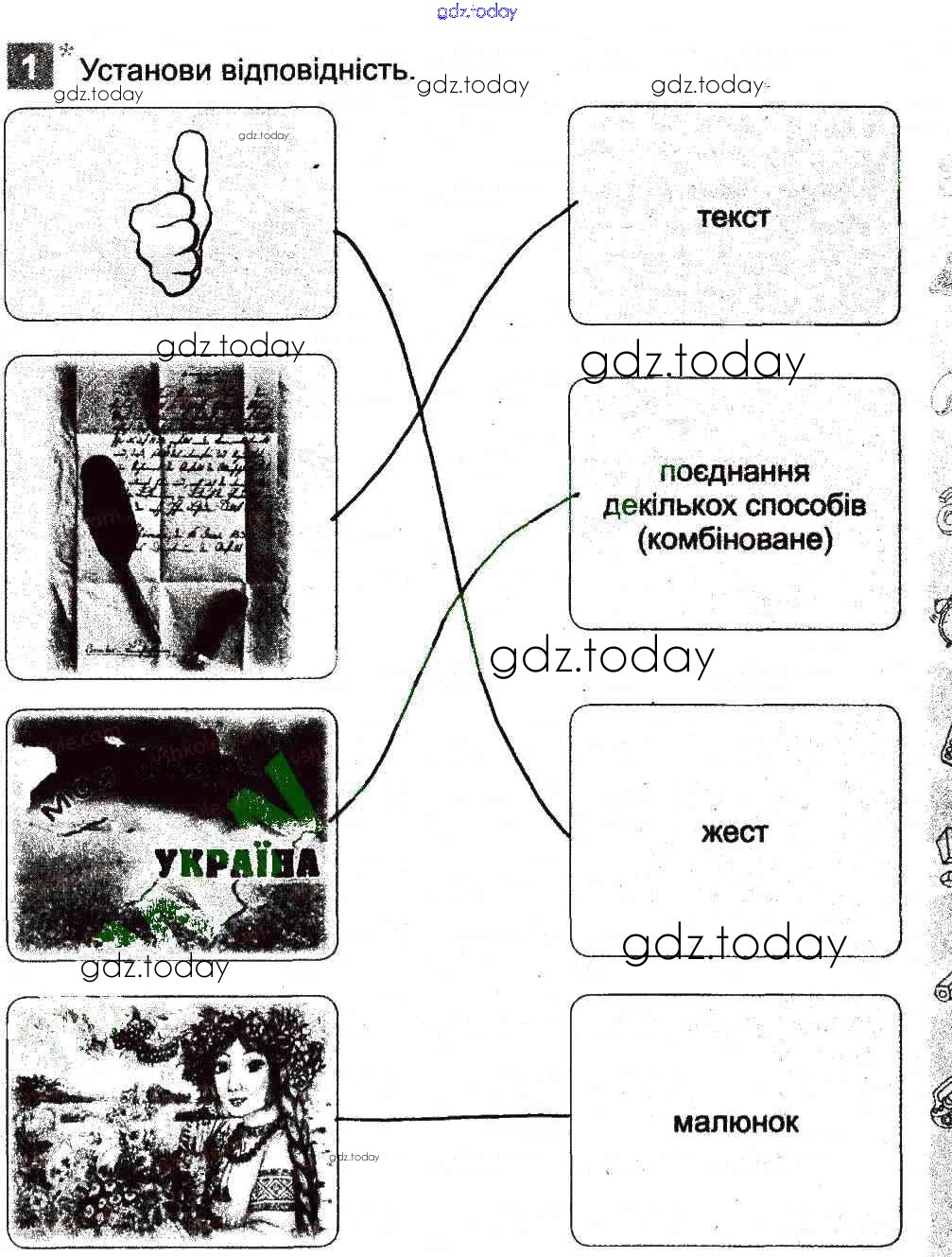 На страницах сайта gdz.today вы найдете учебный и вспомогательный материал, направленный на улучшения знаний школьной программы. ГДЗ - онлайн мир знаний Рішення до Способи подання повідомлень 1 Рабочей тетради по Информатике для 3 класса Коршунова Генеза 2014