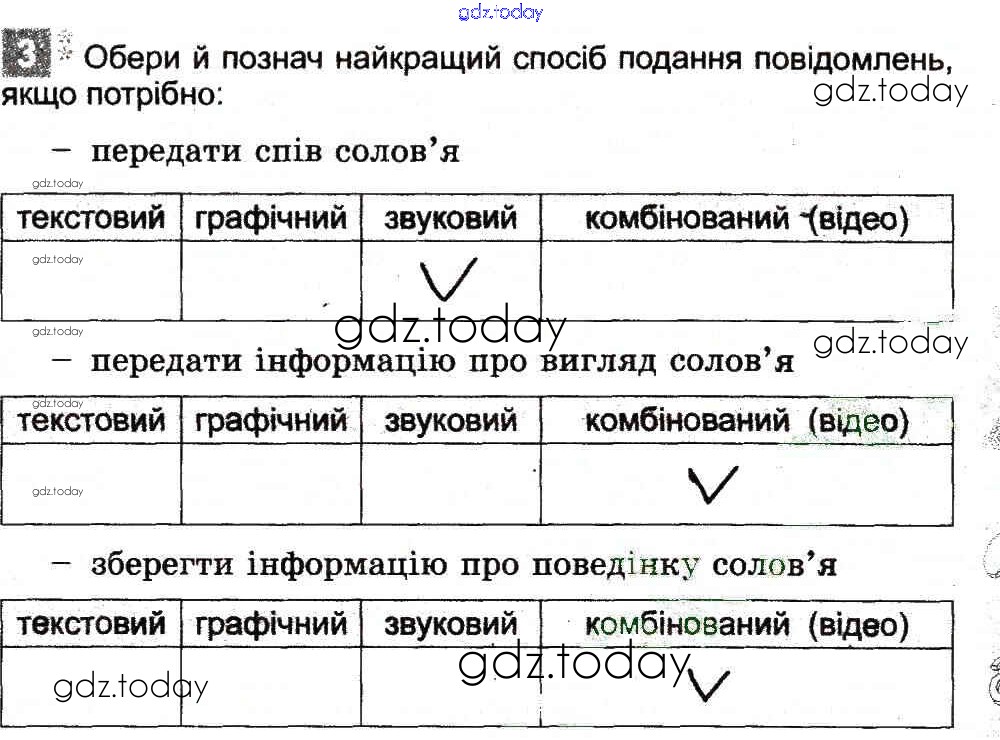На страницах сайта gdz.today вы найдете учебный и вспомогательный материал, направленный на улучшения знаний школьной программы. ГДЗ - онлайн мир знаний Рішення до Способи подання повідомлень 3 Рабочей тетради по Информатике для 3 класса Коршунова Генеза 2014