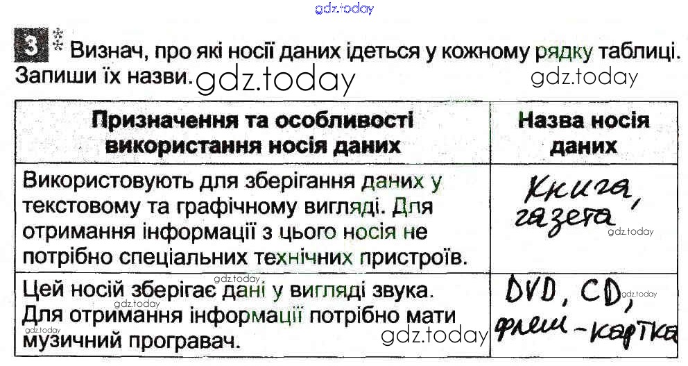 На страницах сайта gdz.today вы найдете учебный и вспомогательный материал, направленный на улучшения знаний школьной программы. ГДЗ - онлайн мир знаний Рішення до Носії повідомлень 3 Рабочей тетради по Информатике для 3 класса Коршунова Генеза 2014