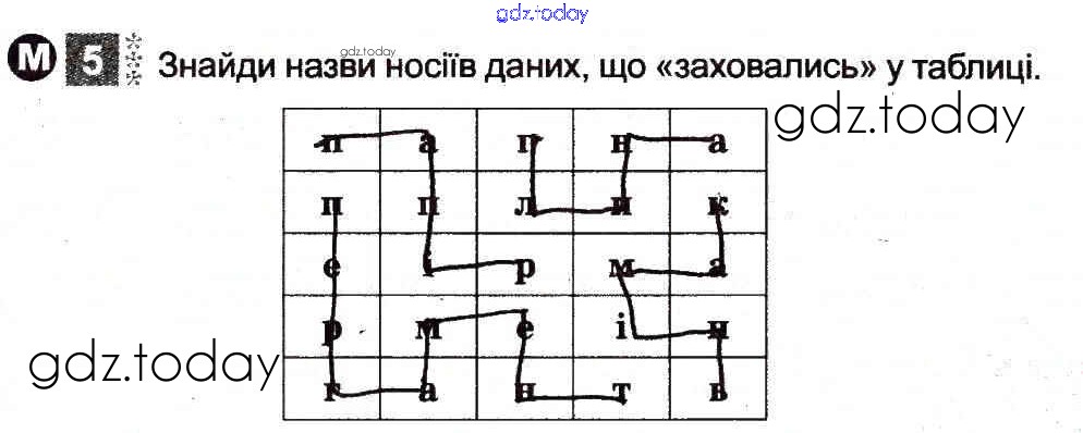 На страницах сайта gdz.today вы найдете учебный и вспомогательный материал, направленный на улучшения знаний школьной программы. ГДЗ - онлайн мир знаний Рішення до Носії повідомлень 5 Рабочей тетради по Информатике для 3 класса Коршунова Генеза 2014