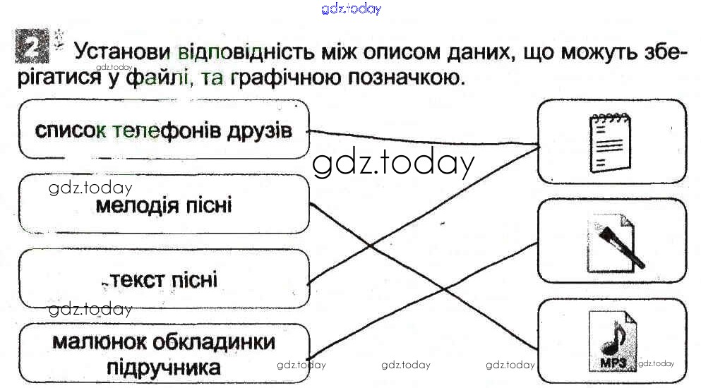 На страницах сайта gdz.today вы найдете учебный и вспомогательный материал, направленный на улучшения знаний школьной программы. ГДЗ - онлайн мир знаний Рішення до Файли 2 Рабочей тетради по Информатике для 3 класса Коршунова Генеза 2014