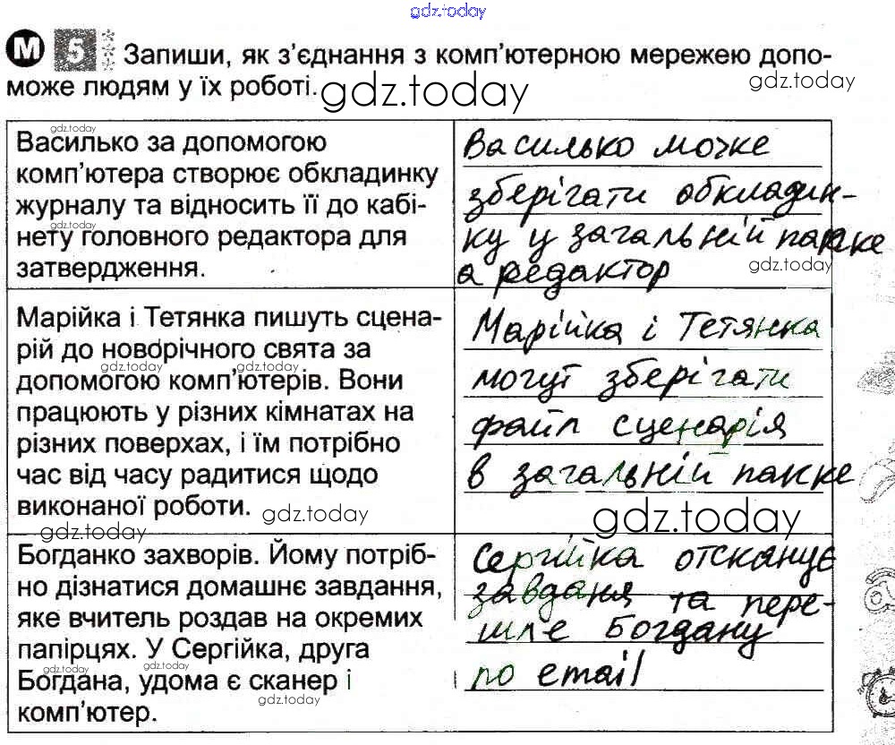 На страницах сайта gdz.today вы найдете учебный и вспомогательный материал, направленный на улучшения знаний школьной программы. ГДЗ - онлайн мир знаний Рішення до Комп’ютерна мережа 5 Рабочей тетради по Информатике для 3 класса Коршунова Генеза 2014