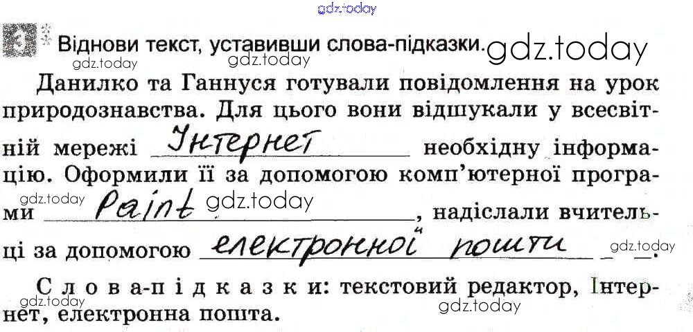 На страницах сайта gdz.today вы найдете учебный и вспомогательный материал, направленный на улучшения знаний школьной программы. ГДЗ - онлайн мир знаний Рішення до Інтернет 3 Рабочей тетради по Информатике для 3 класса Коршунова Генеза 2014