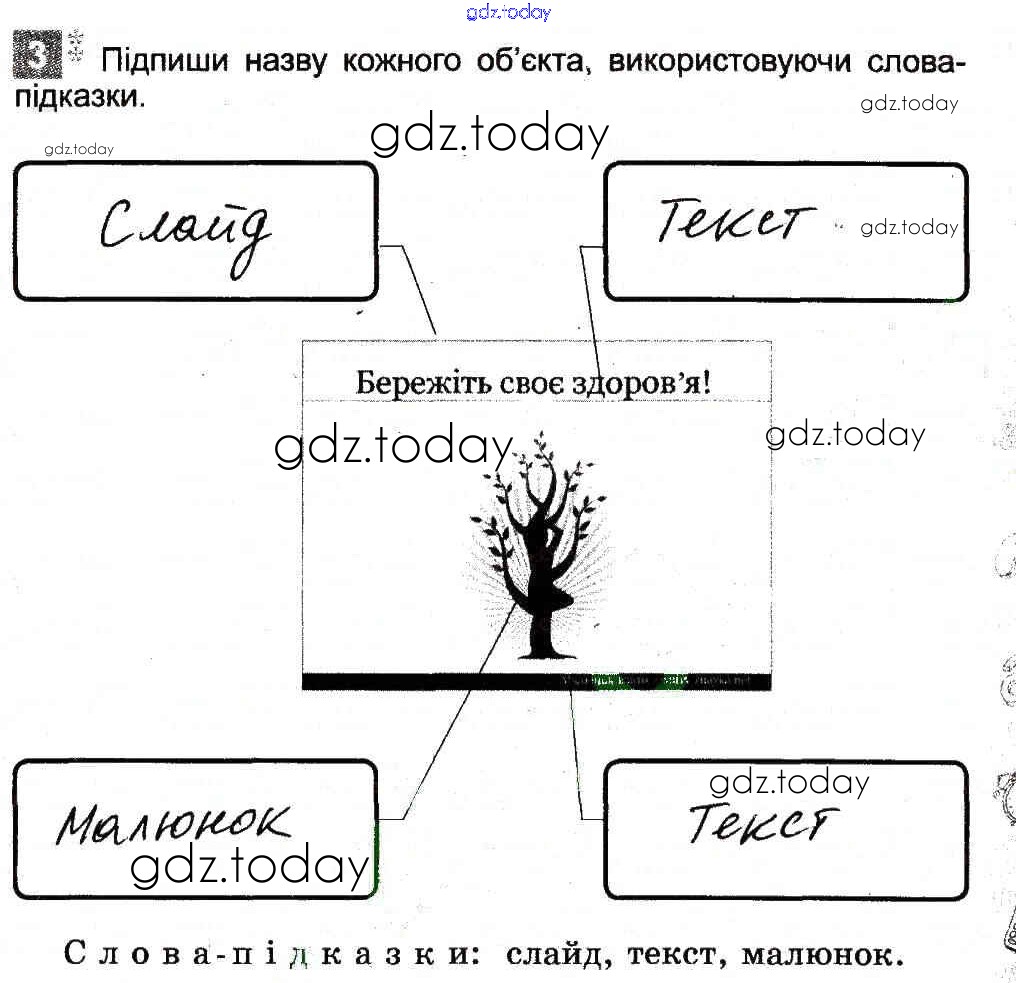 На страницах сайта gdz.today вы найдете учебный и вспомогательный материал, направленный на улучшения знаний школьной программы. ГДЗ - онлайн мир знаний Рішення до Презентація та слайди 3 Рабочей тетради по Информатике для 3 класса Коршунова Генеза 2014