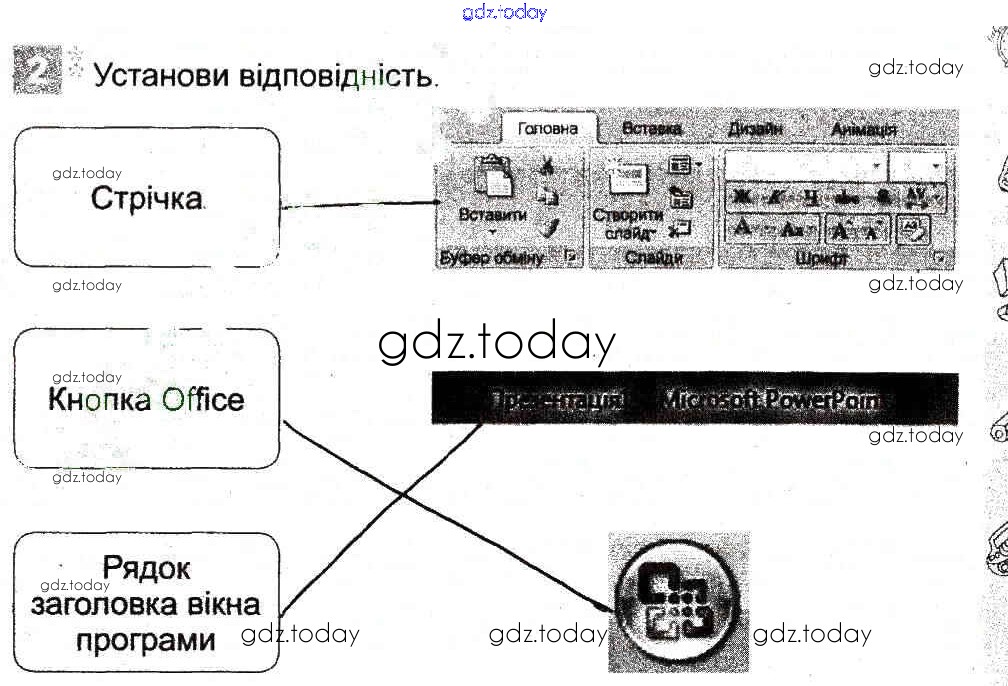На страницах сайта gdz.today вы найдете учебный и вспомогательный материал, направленный на улучшения знаний школьной программы. ГДЗ - онлайн мир знаний Рішення до Середовище редактора презентацій 2 Рабочей тетради по Информатике для 3 класса Коршунова Генеза 2014