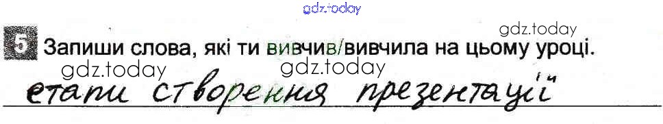 На страницах сайта gdz.today вы найдете учебный и вспомогательный материал, направленный на улучшения знаний школьной программы. ГДЗ - онлайн мир знаний Рішення до Етапи створення презентації 5 Рабочей тетради по Информатике для 3 класса Коршунова Генеза 2014