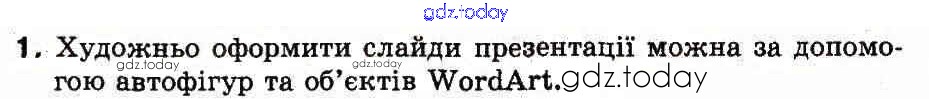 На страницах сайта gdz.today вы найдете учебный и вспомогательный материал, направленный на улучшения знаний школьной программы. ГДЗ - онлайн мир знаний Рішення до тему 22. Як створювати графiчнi об'єкти презентації Учебнику по Информатике для 3 класса Зарецкая, Корниенко Ранок 2013