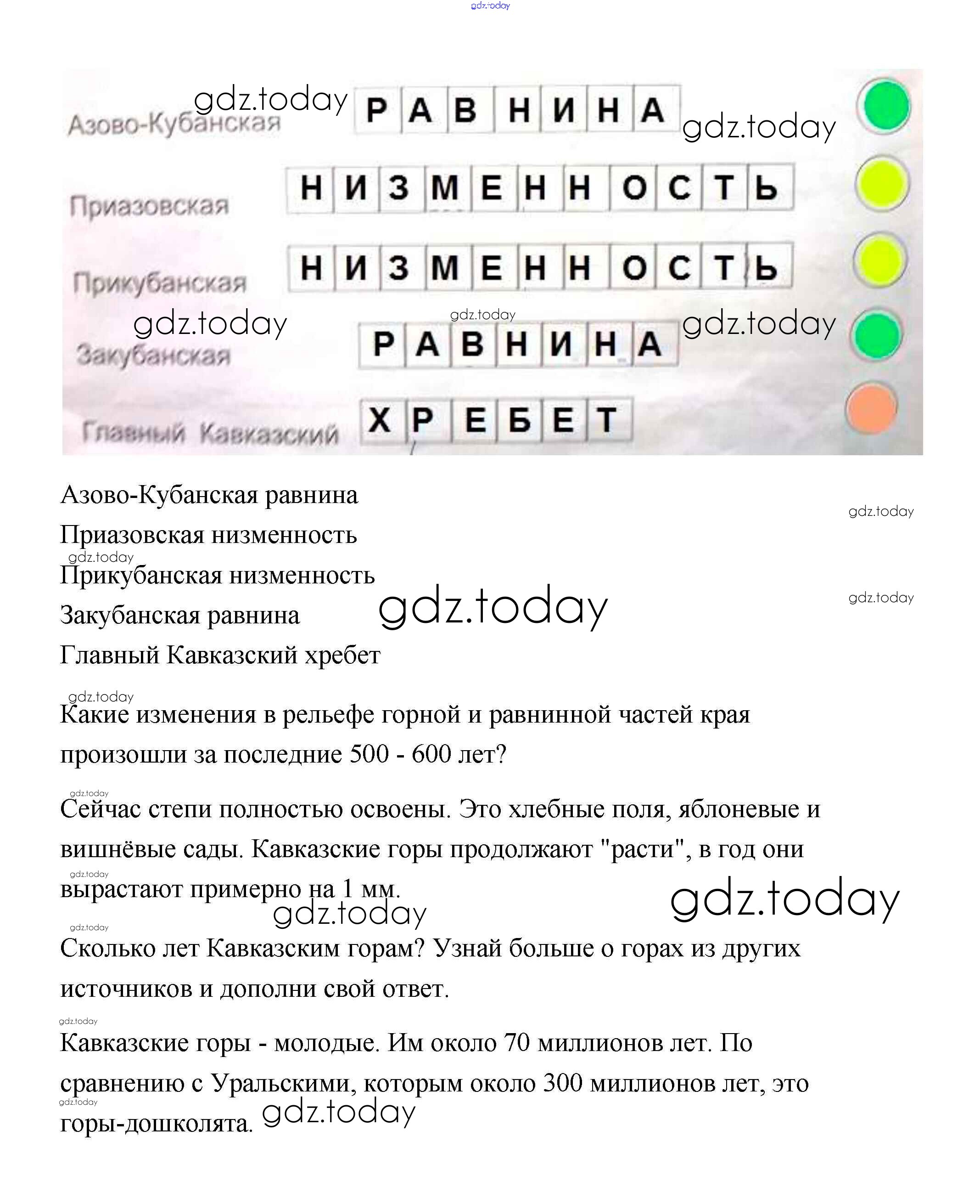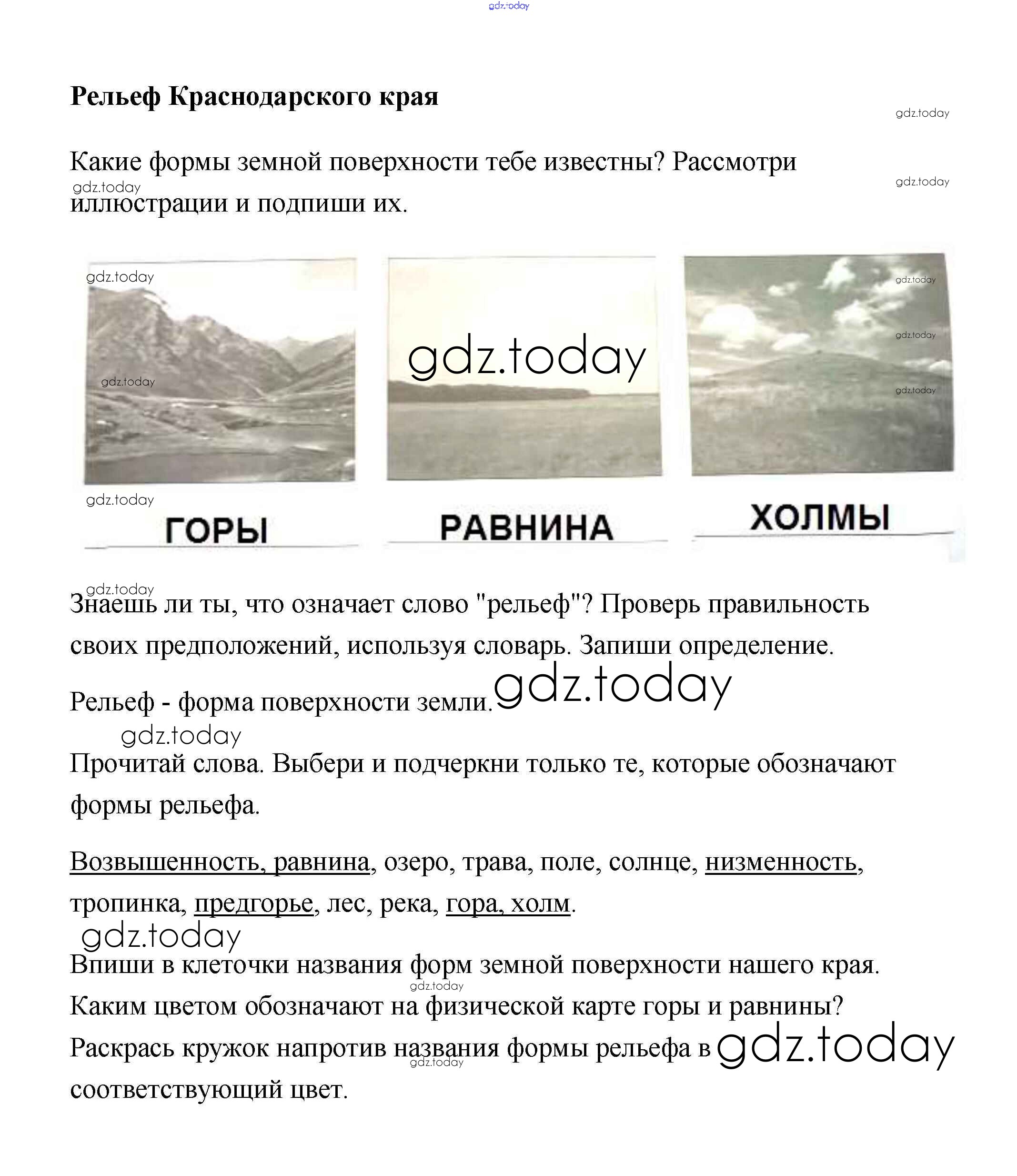 На страницах сайта gdz.today вы найдете учебный и вспомогательный материал, направленный на улучшения знаний школьной программы. ГДЗ - онлайн мир знаний Решение. Темы Рельеф Краснодарского края Рабочей тетради по Кубановедению для 3 класса Науменко Перспективы образования 2017