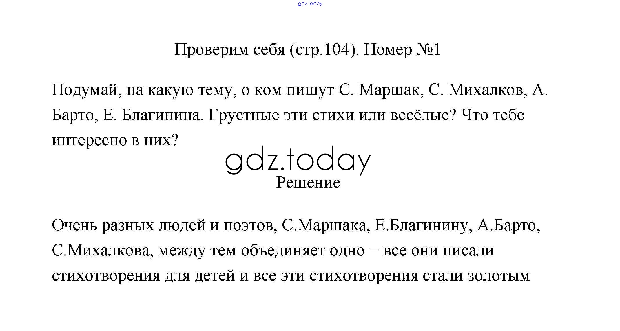 На страницах сайта gdz.today вы найдете учебный и вспомогательный материал, направленный на улучшения знаний школьной программы. ГДЗ - онлайн мир знаний Ршение к части 2 (Страницы) 104 Учебнику по Литературному чтению для 3 класса Климанова, Горецкий Просвещение Школа России 2020
