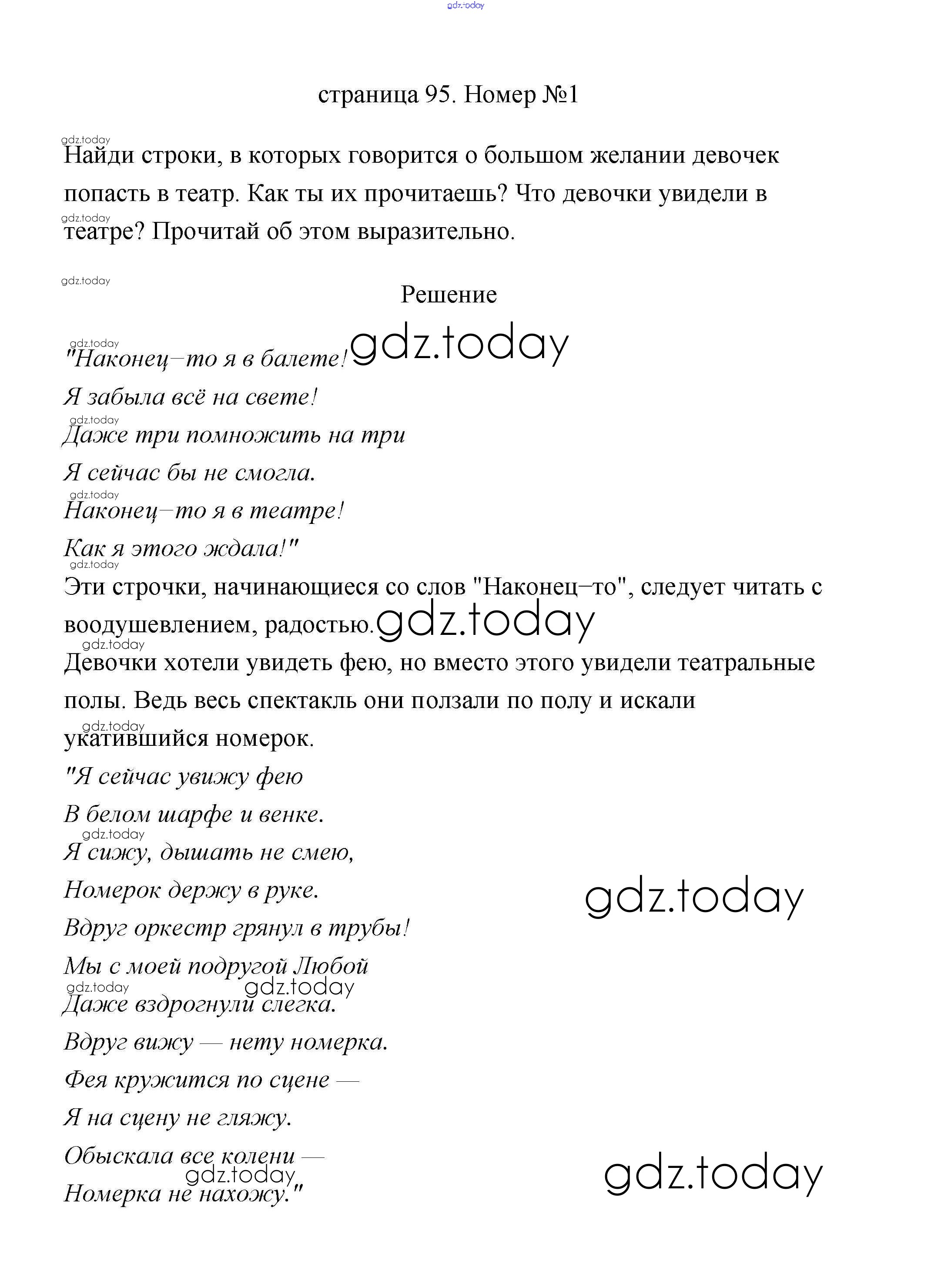На страницах сайта gdz.today вы найдете учебный и вспомогательный материал, направленный на улучшения знаний школьной программы. ГДЗ - онлайн мир знаний Ршение к части 2 (Страницы) 95 Учебнику по Литературному чтению для 3 класса Климанова, Горецкий Просвещение Школа России 2020