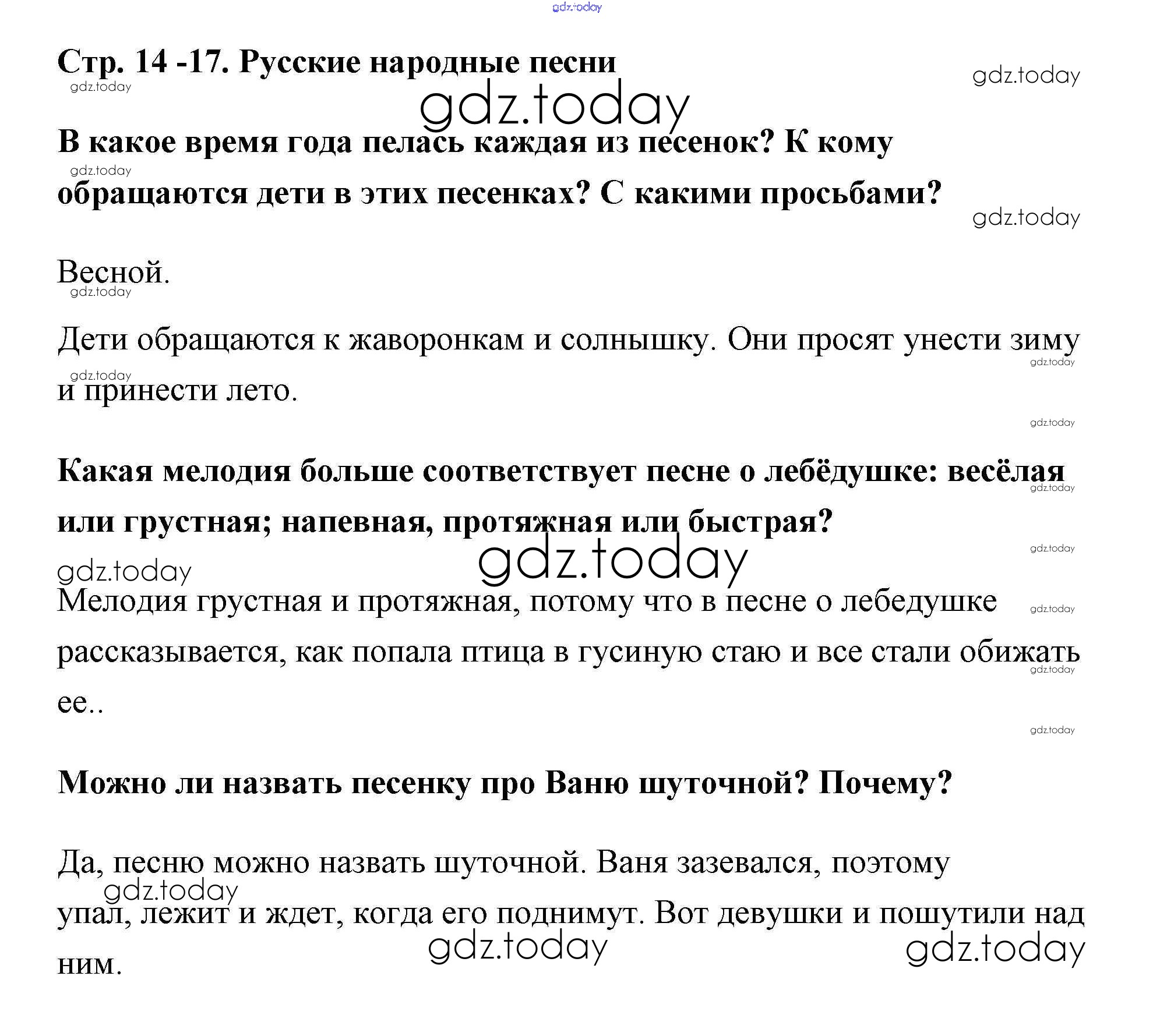 На страницах сайта gdz.today вы найдете учебный и вспомогательный материал, направленный на улучшения знаний школьной программы. ГДЗ - онлайн мир знаний Решение к части 1 (Страницы) 14-17 Учебнику по Литературному чтению для 3 класса Климанова, Горецкий Просвещение Школа России 2018