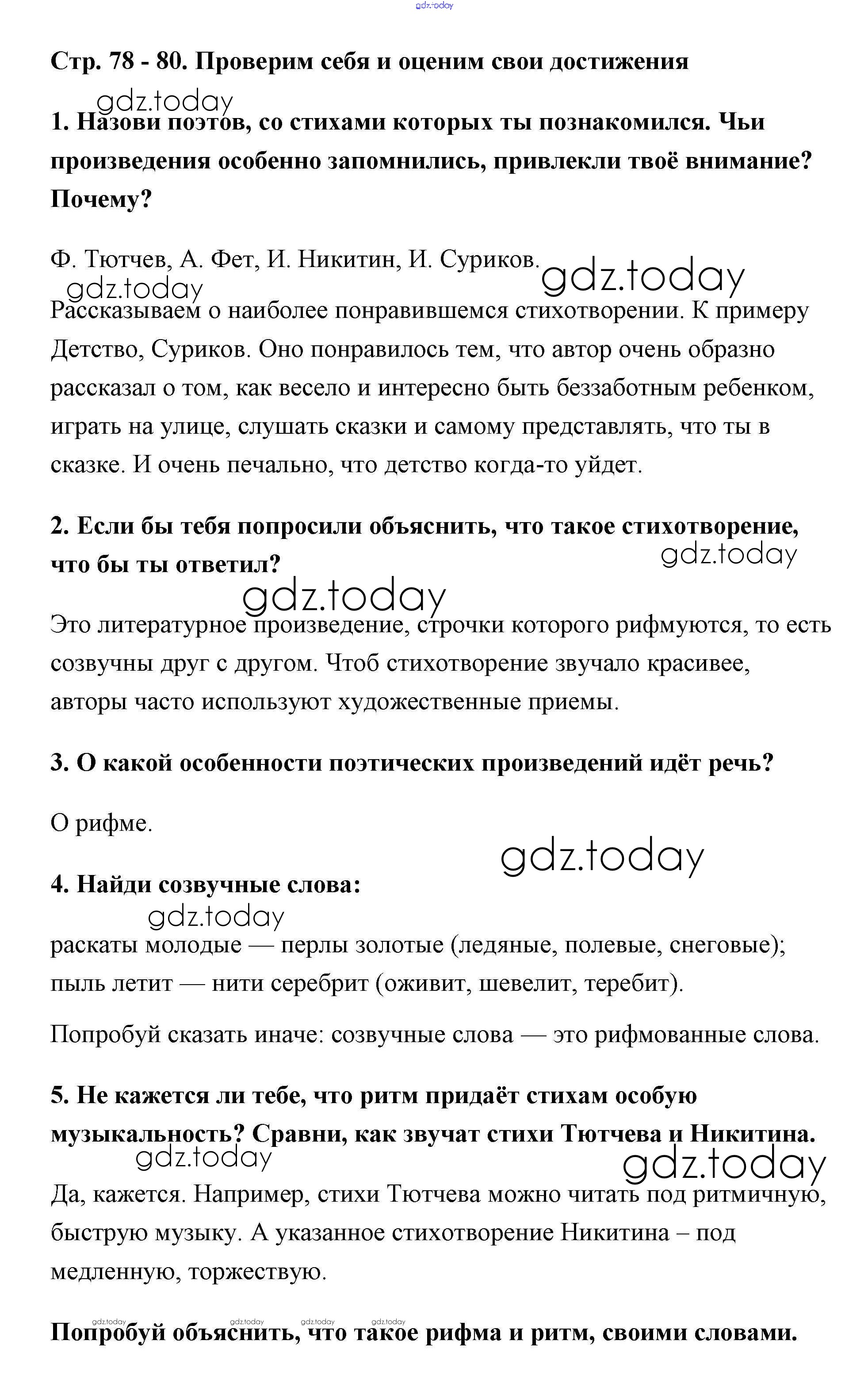 На страницах сайта gdz.today вы найдете учебный и вспомогательный материал, направленный на улучшения знаний школьной программы. ГДЗ - онлайн мир знаний Решение к части 1 (Страницы) 78-80 Учебнику по Литературному чтению для 3 класса Климанова, Горецкий Просвещение Школа России 2018