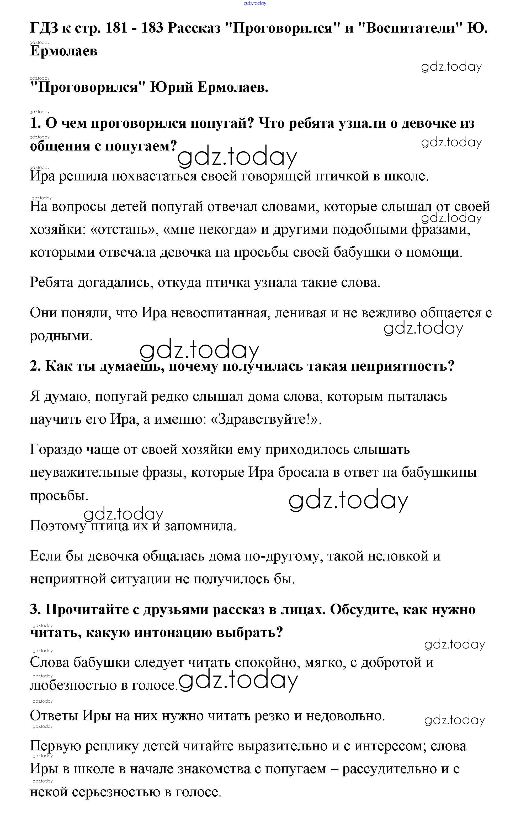 На страницах сайта gdz.today вы найдете учебный и вспомогательный материал, направленный на улучшения знаний школьной программы. ГДЗ - онлайн мир знаний Решение к части 2 (Страницы) 181-183 Учебнику по Литературному чтению для 3 класса Климанова, Горецкий Просвещение Школа России 2018
