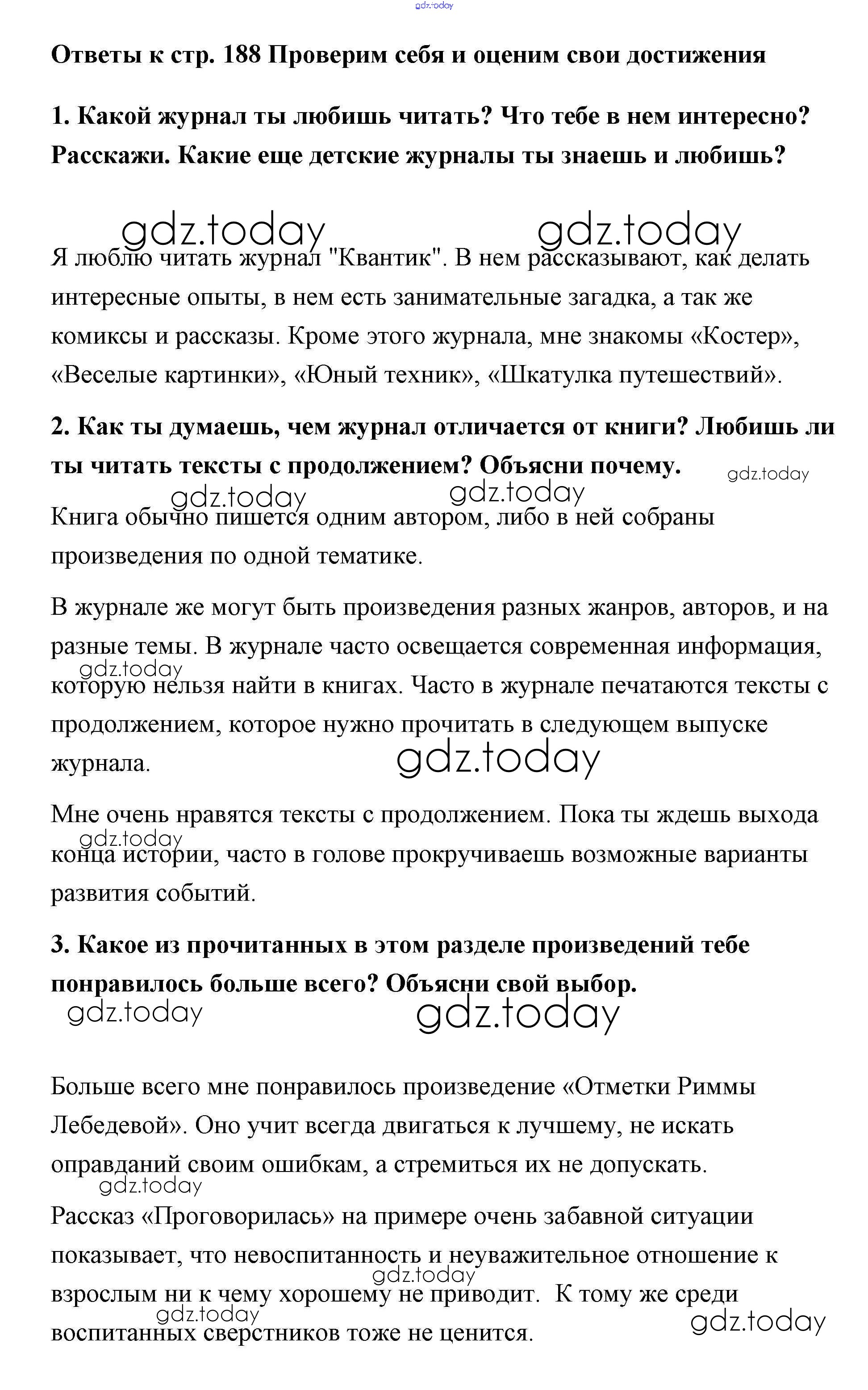 На страницах сайта gdz.today вы найдете учебный и вспомогательный материал, направленный на улучшения знаний школьной программы. ГДЗ - онлайн мир знаний Решение к части 2 (Страницы) 188 Учебнику по Литературному чтению для 3 класса Климанова, Горецкий Просвещение Школа России 2018