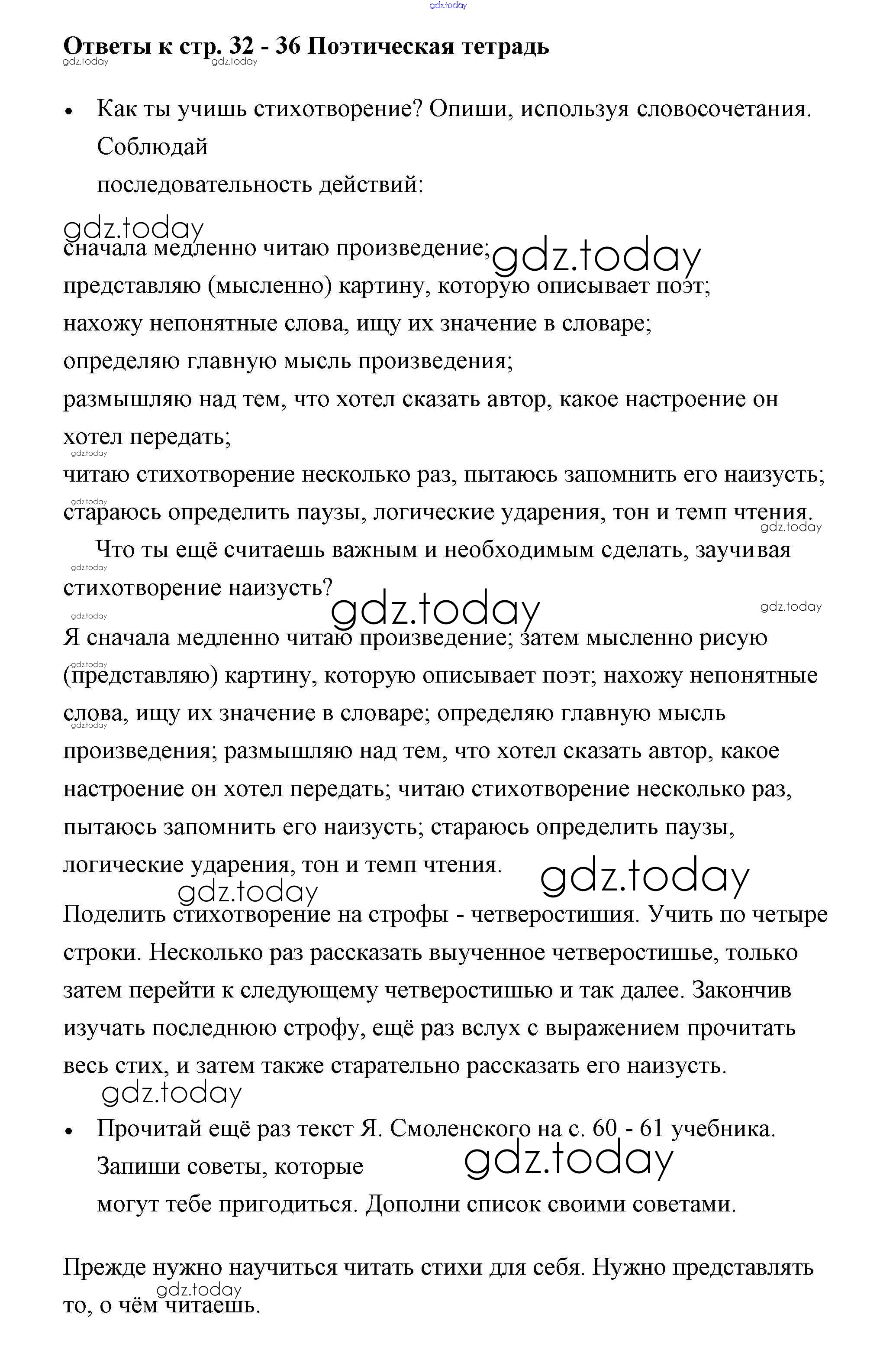 На страницах сайта gdz.today вы найдете учебный и вспомогательный материал, направленный на улучшения знаний школьной программы. ГДЗ - онлайн мир знаний Страницы (решение) 32-36 Рабочей тетради по Литературному чтению для 3 класса Бойкина, Виноградская Просвещение Школа России 2018