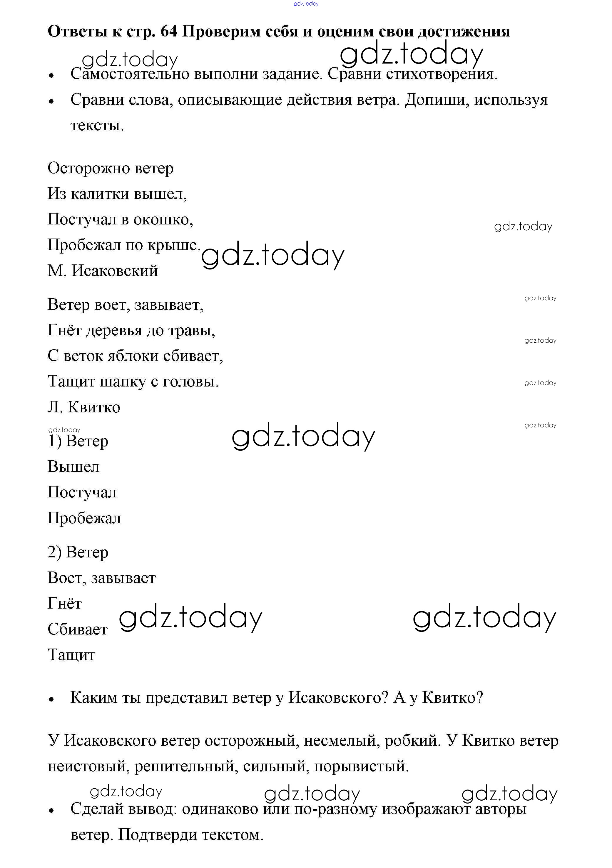 На страницах сайта gdz.today вы найдете учебный и вспомогательный материал, направленный на улучшения знаний школьной программы. ГДЗ - онлайн мир знаний Страницы (решение) 64 Рабочей тетради по Литературному чтению для 3 класса Бойкина, Виноградская Просвещение Школа России 2018