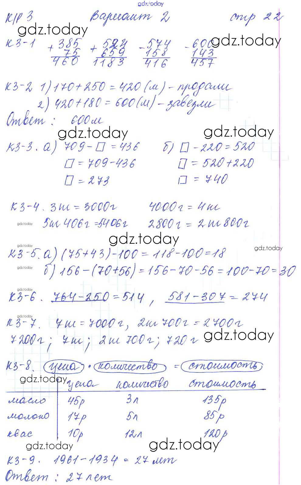 На страницах сайта gdz.today вы найдете учебный и вспомогательный материал, направленный на улучшения знаний школьной программы. ГДЗ - онлайн мир знаний Решение к контрольной работе №3 вариант 2 Контрольным и диагностическим работам по Математике для 3 класса Башмаков, Нефедова Дрофа Планета знаний 2018