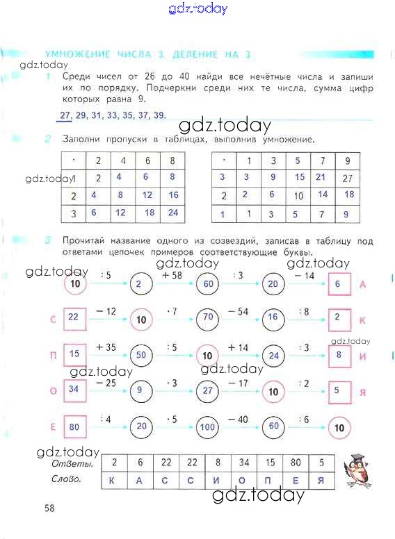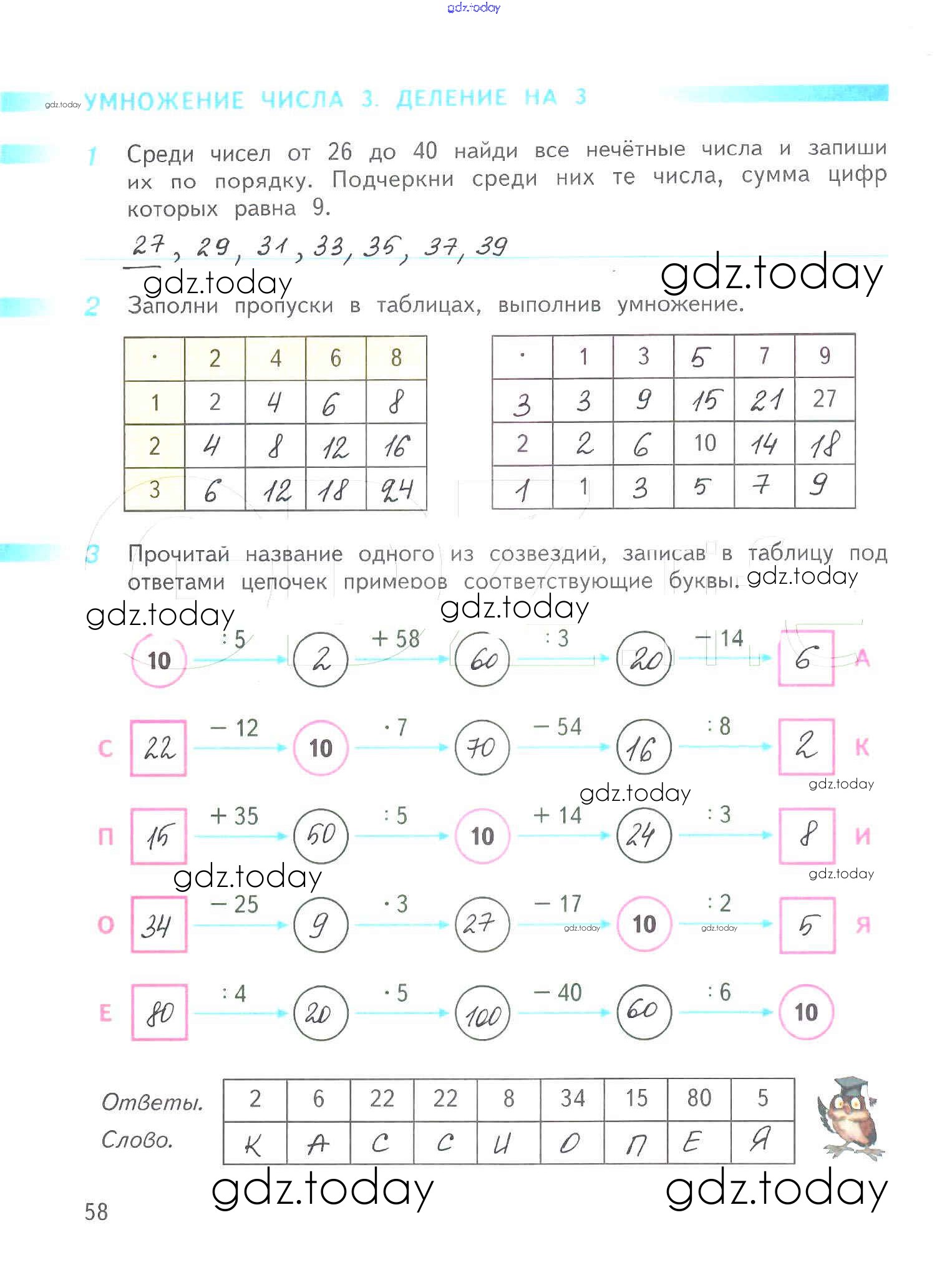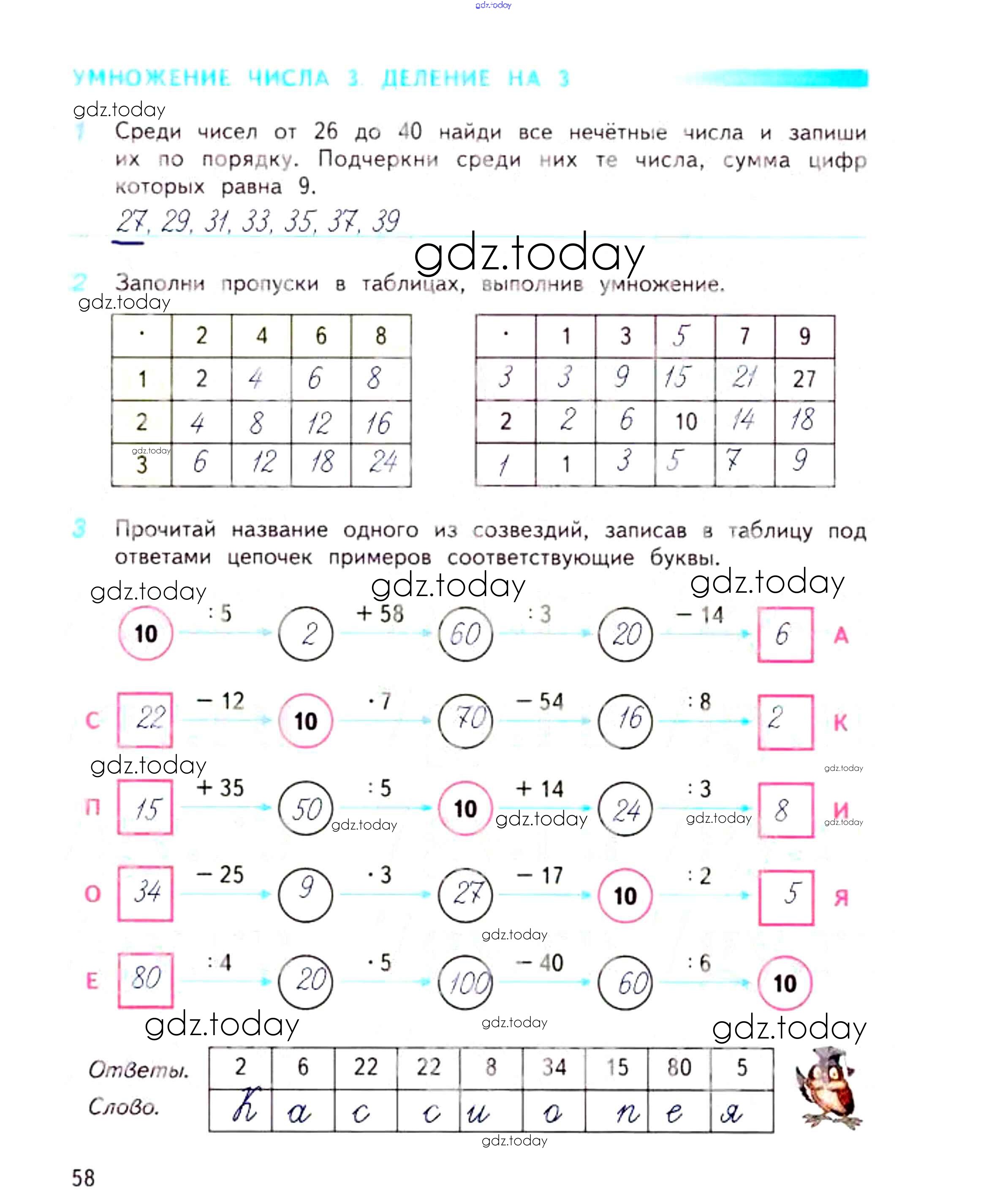 На страницах сайта gdz.today вы найдете учебный и вспомогательный материал, направленный на улучшения знаний школьной программы. ГДЗ - онлайн мир знаний Решение к части 1. Страницы 58 Рабочей тетради по Математике для 3 класса Дорофеев, Миракова Просвещение Перспектива 2017