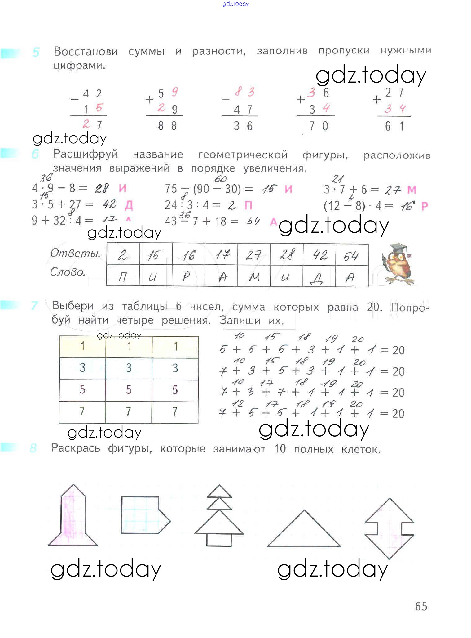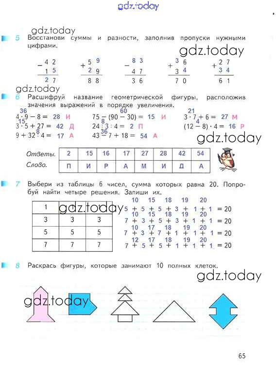 На страницах сайта gdz.today вы найдете учебный и вспомогательный материал, направленный на улучшения знаний школьной программы. ГДЗ - онлайн мир знаний Решение к части 1. Страницы 65 Рабочей тетради по Математике для 3 класса Дорофеев, Миракова Просвещение Перспектива 2017
