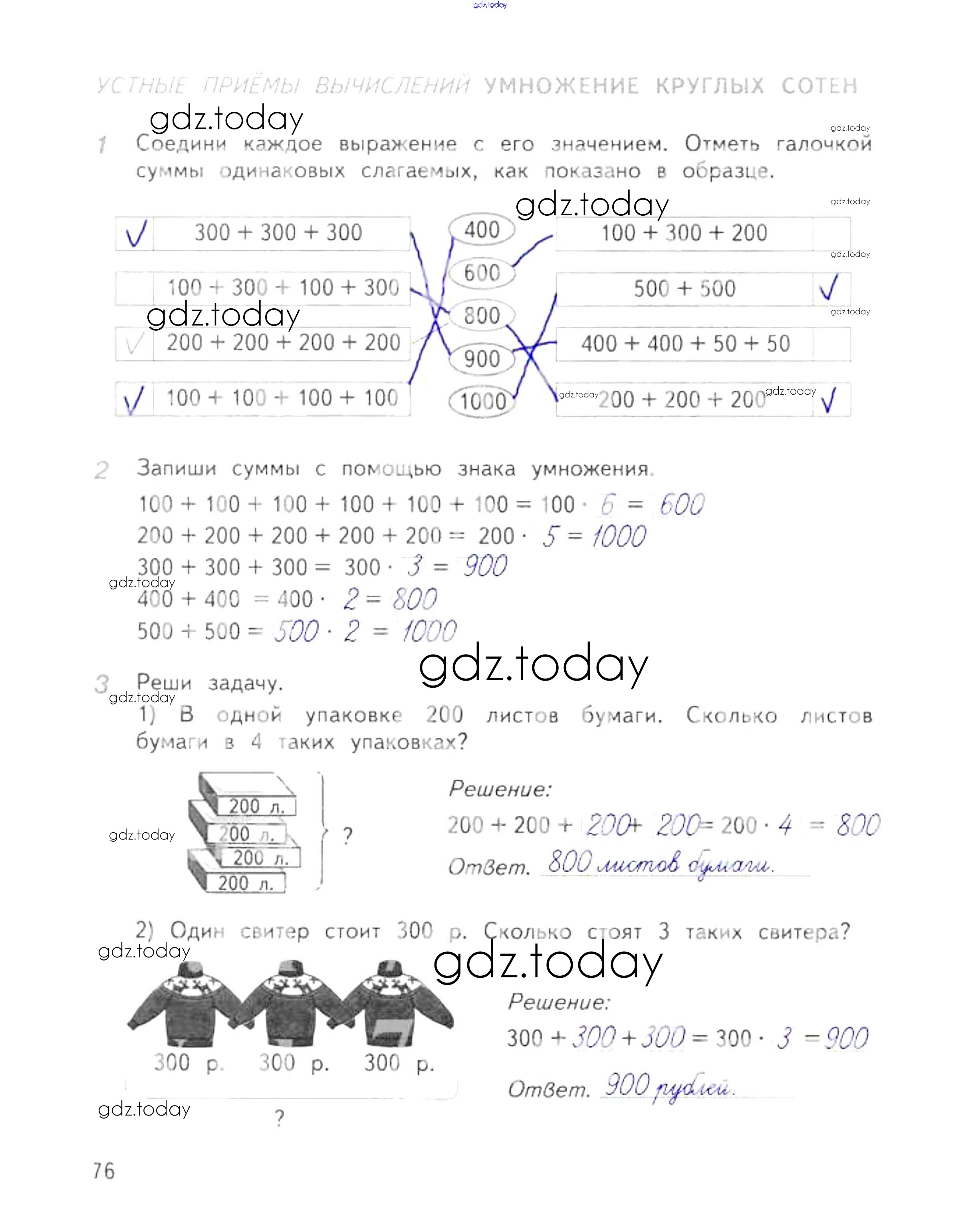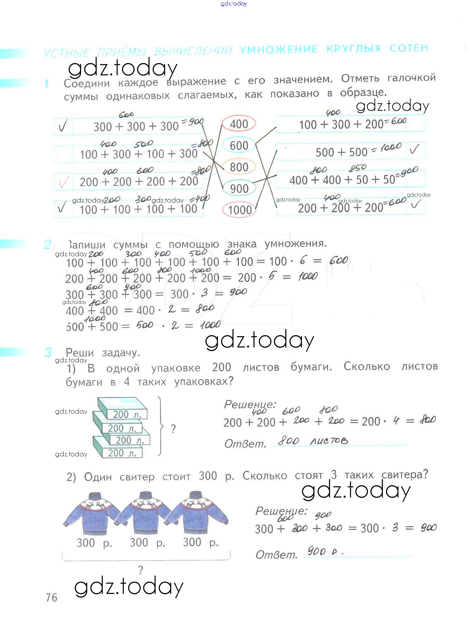 На страницах сайта gdz.today вы найдете учебный и вспомогательный материал, направленный на улучшения знаний школьной программы. ГДЗ - онлайн мир знаний Решение к части2. Страницы 76 Рабочей тетради по Математике для 3 класса Дорофеев, Миракова Просвещение Перспектива 2017