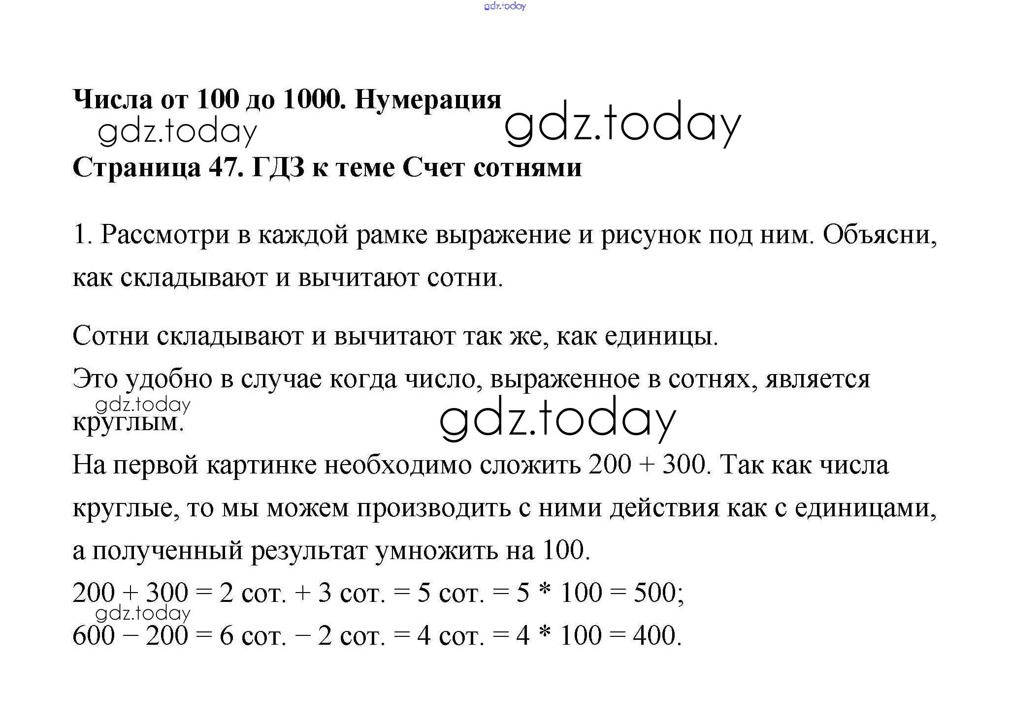 На страницах сайта gdz.today вы найдете учебный и вспомогательный материал, направленный на улучшения знаний школьной программы. ГДЗ - онлайн мир знаний Страница 47 Решение к части 2 1 Учебнику по Математике для 3 класса Дорофеев, Миракова Просвещение 2015