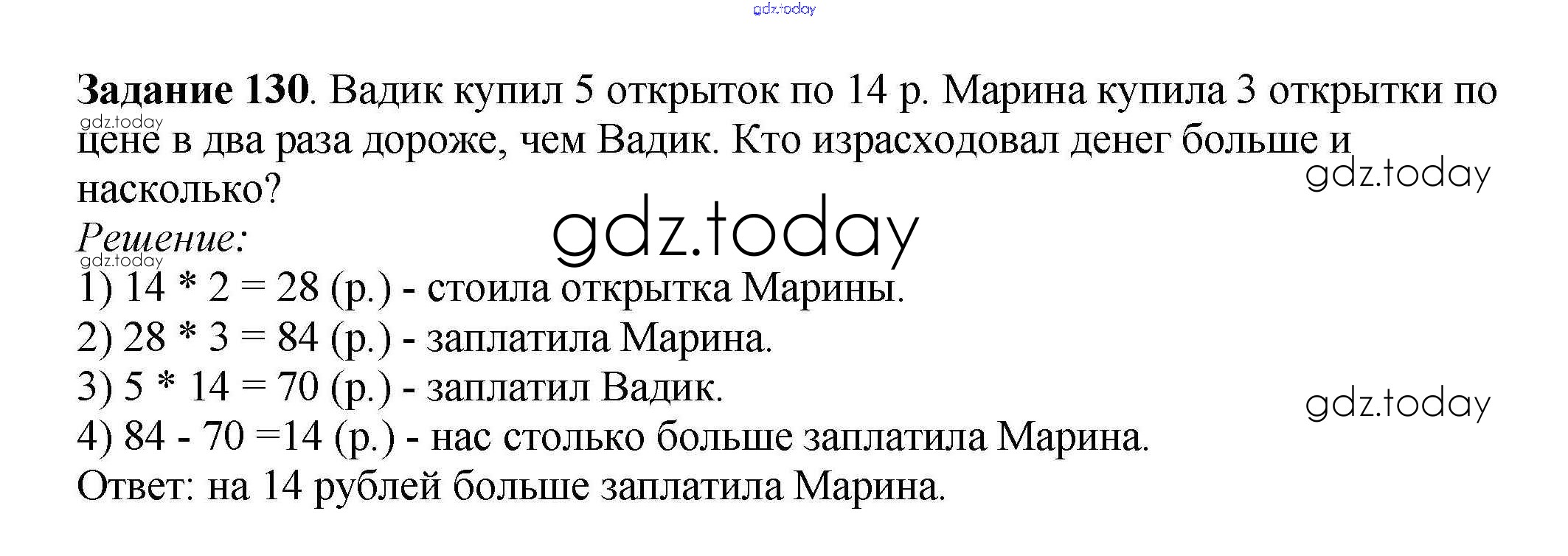 На страницах сайта gdz.today вы найдете учебный и вспомогательный материал, направленный на улучшения знаний школьной программы. ГДЗ - онлайн мир знаний Решение к части 2 (упражнения) 130 Учебнику по Математике для 3 класса Истомина Ассоциация 21 век Гармония 2014