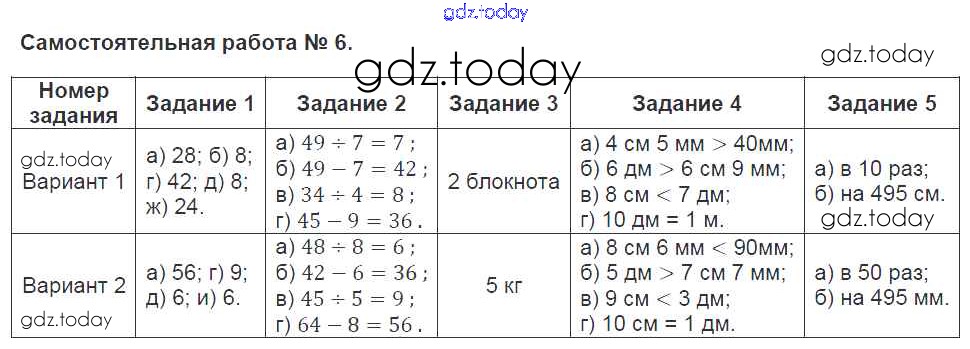 На страницах сайта gdz.today вы найдете учебный и вспомогательный материал, направленный на улучшения знаний школьной программы. ГДЗ - онлайн мир знаний Решение к самостоятельным работам 6 Контрольно-измерительным материалам (КИМ) по Математике для 3 класса Ситникова ВАКО 2017