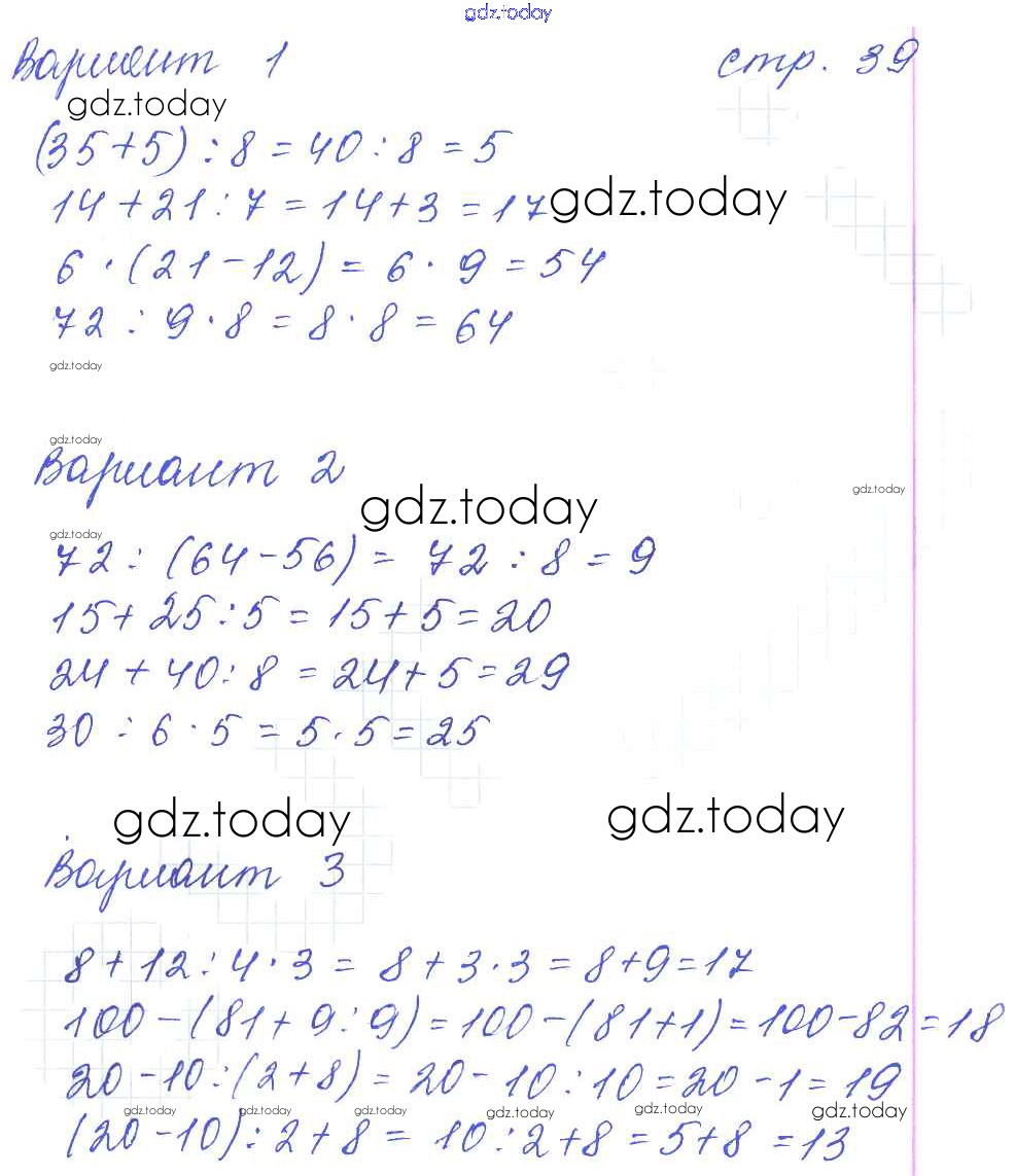 На страницах сайта gdz.today вы найдете учебный и вспомогательный материал, направленный на улучшения знаний школьной программы. ГДЗ - онлайн мир знаний Решение к части 1 (страницы) 39 Контрольным работам по Математике для 3 класса Рудницкая Экзамен УМК 2017