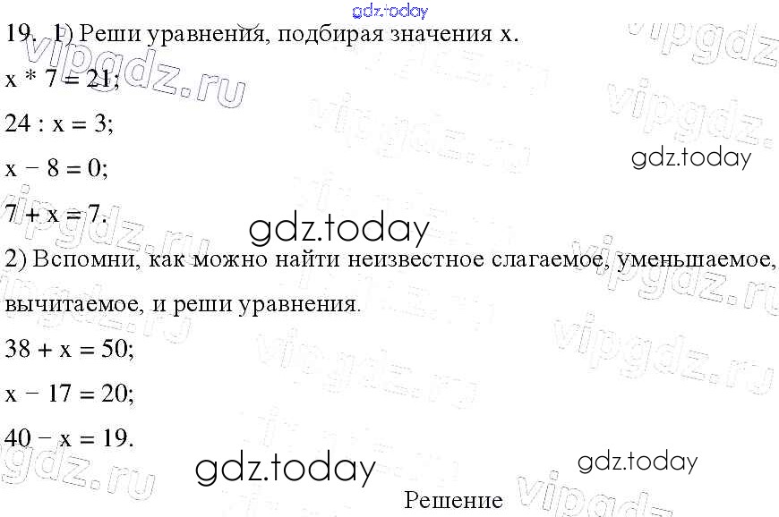 На страницах сайта gdz.today вы найдете учебный и вспомогательный материал, направленный на улучшения знаний школьной программы. ГДЗ - онлайн мир знаний Страница 29-31 Решение к части 1 19 Учебнику по Математике для 3 класса Моро, Бантова Просвещение Школа России 2015