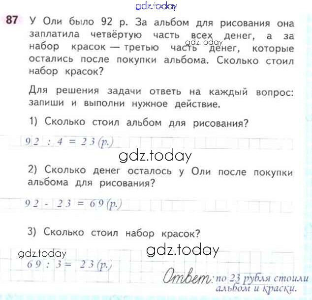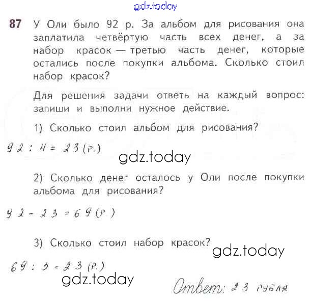 На страницах сайта gdz.today вы найдете учебный и вспомогательный материал, направленный на улучшения знаний школьной программы. ГДЗ - онлайн мир знаний Страница 3-38 (Внетабличное умножение и деление) Решение к части 2 87 Рабочей тетради по Математике для 3 класса Моро, Волкова Просвещение Школа России 2016