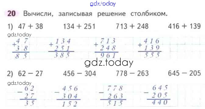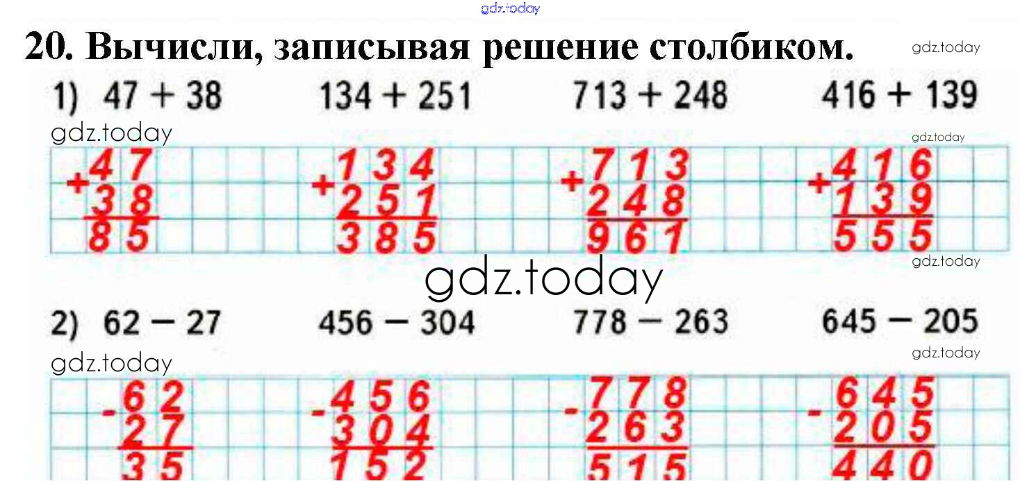 На страницах сайта gdz.today вы найдете учебный и вспомогательный материал, направленный на улучшения знаний школьной программы. ГДЗ - онлайн мир знаний Страница 47-58 (Сложение и вычитание) Решение к части 2 20 Рабочей тетради по Математике для 3 класса Моро, Волкова Просвещение Школа России 2016