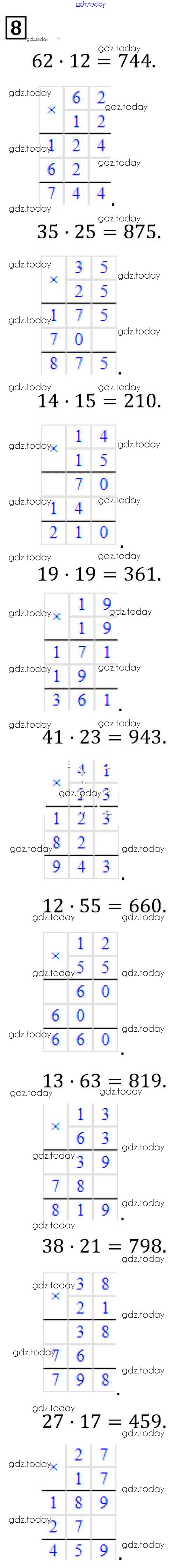 Ответы к Умножение на двузначное число Решение к части 2 (упражнения) 8 Учебнику по Математике для 3 класса Рудницкая, Юдачева Вентана-граф Начальная школа XXI века 2016