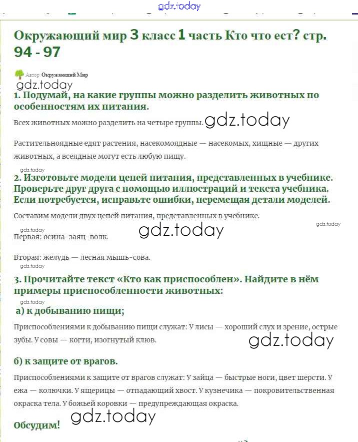 На страницах сайта gdz.today вы найдете учебный и вспомогательный материал, направленный на улучшения знаний школьной программы. ГДЗ - онлайн мир знаний Эта удивительная природа Решение к части 1 94 Учебнику по Окружающему миру для 3 класса Плешаков Просвещение Школа России 2017