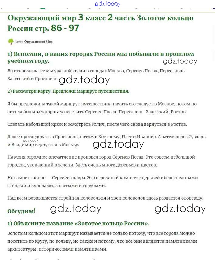 На страницах сайта gdz.today вы найдете учебный и вспомогательный материал, направленный на улучшения знаний школьной программы. ГДЗ - онлайн мир знаний Путешествие по городам и странам Решение к части 2 86 Учебнику по Окружающему миру для 3 класса Плешаков Просвещение Школа России 2017