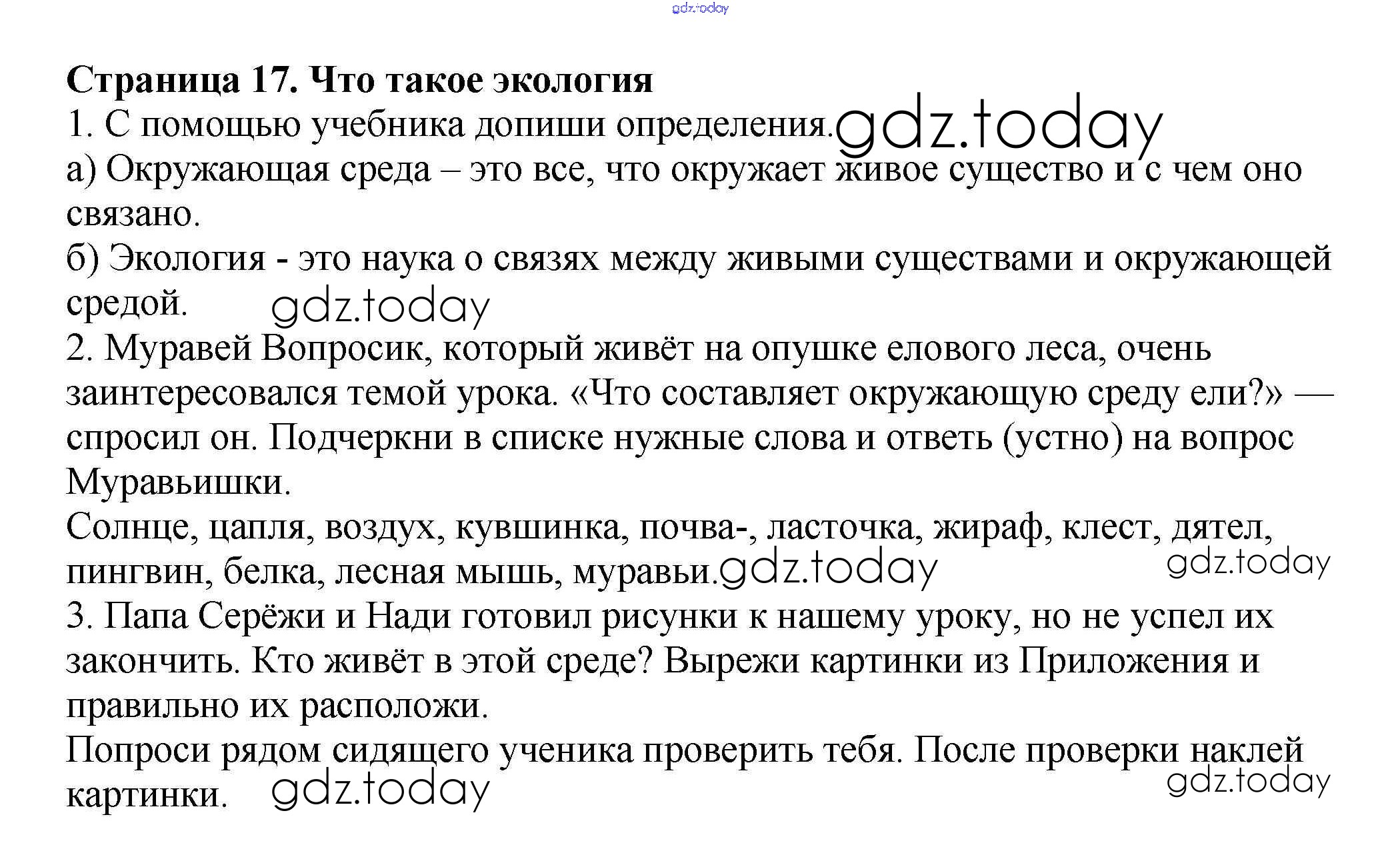 На страницах сайта gdz.today вы найдете учебный и вспомогательный материал, направленный на улучшения знаний школьной программы. ГДЗ - онлайн мир знаний Решение к части 1. Страницы 17 Рабочей тетради по Окружающему миру для 3 класса Плешаков, Новицкая Просвещение Перспектива 2013