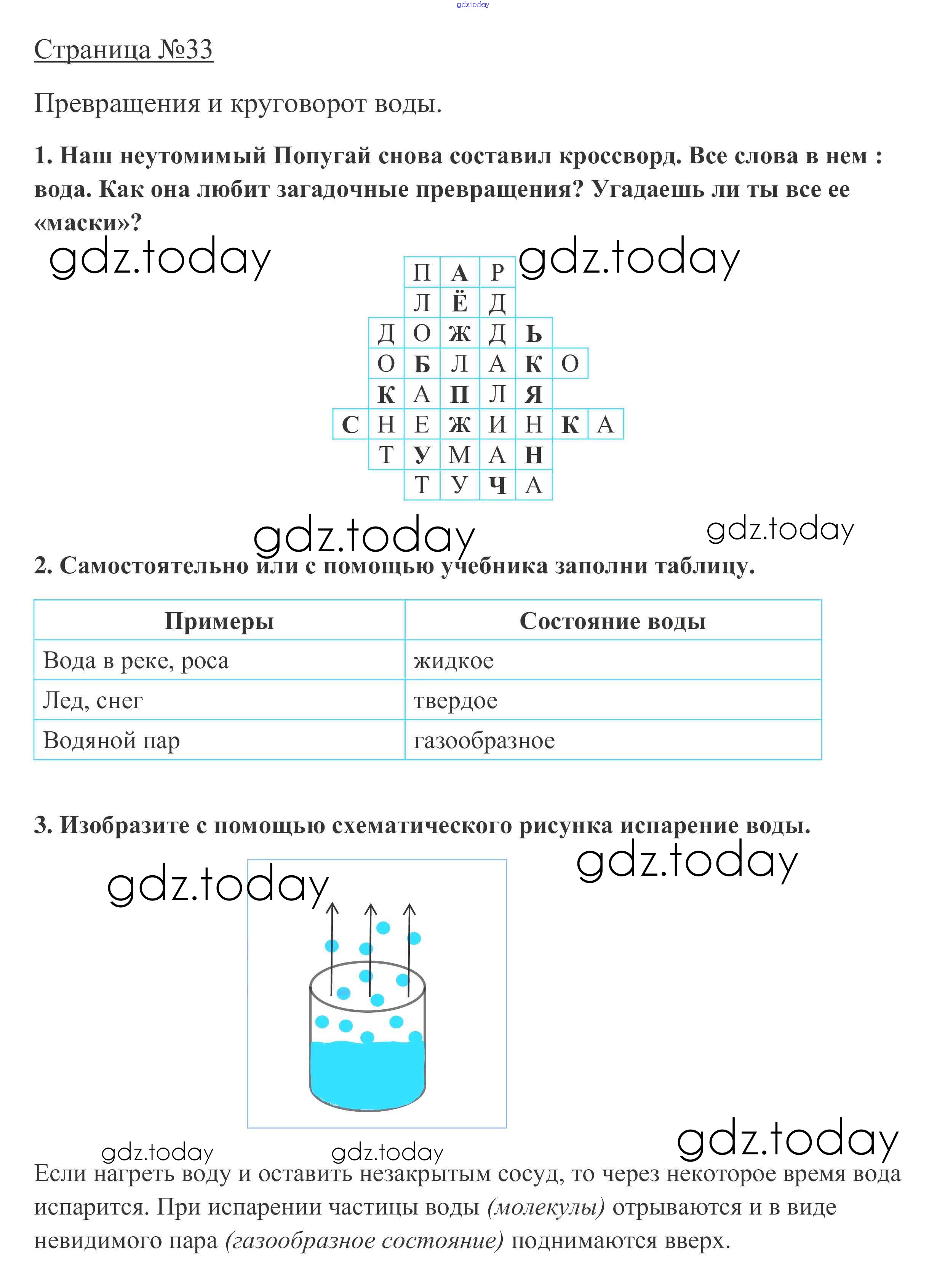 На страницах сайта gdz.today вы найдете учебный и вспомогательный материал, направленный на улучшения знаний школьной программы. ГДЗ - онлайн мир знаний Ответы к части 1. Страницы 33 Рабочей тетради по Окружающему миру для 3 класса Плешаков Просвещение Школа России 2017