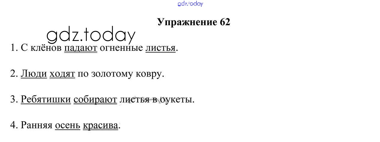 На страницах сайта gdz.today вы найдете учебный и вспомогательный материал, направленный на улучшения знаний школьной программы. ГДЗ - онлайн мир знаний Решение к части 1. Упражнения 62 Учебнику по Русскому языку для 3 класса Антипова, Верниковская Сэр-Вит 2019