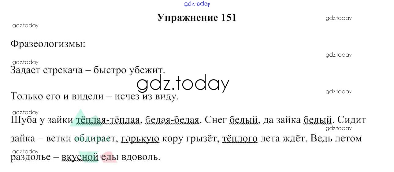 На страницах сайта gdz.today вы найдете учебный и вспомогательный материал, направленный на улучшения знаний школьной программы. ГДЗ - онлайн мир знаний Решение к части 2. Упражнения 151 Учебнику по Русскому языку для 3 класса Антипова, Верниковская Сэр-Вит 2019