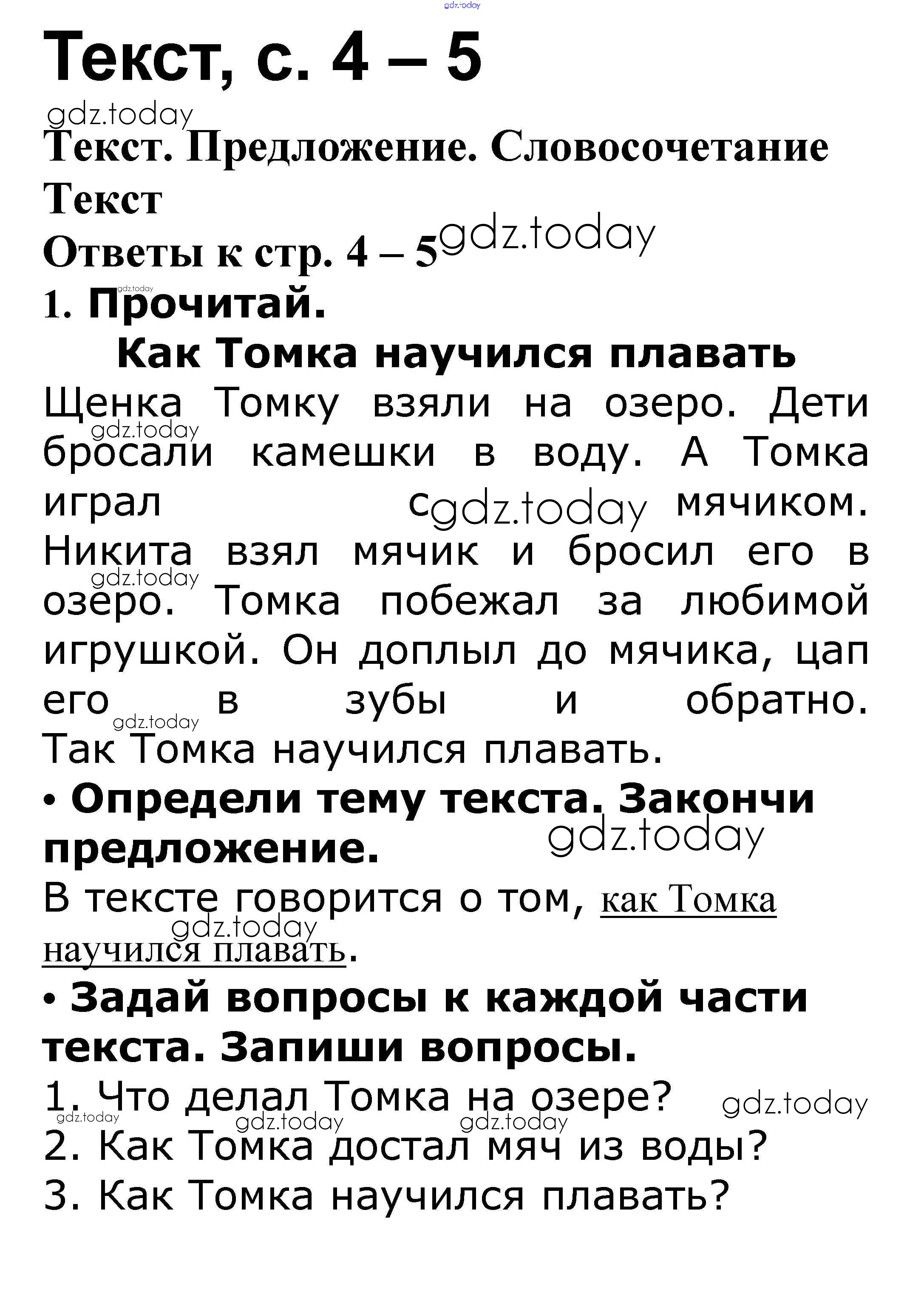 На страницах сайта gdz.today вы найдете учебный и вспомогательный материал, направленный на улучшения знаний школьной программы. ГДЗ - онлайн мир знаний Решение к теме "Текст. Предложение. Словосочетание" Текст стр. 4 – 5 Проверочным работам по Русскому языку для 3 класса Канакина, Щеголева Просвещение Школа России 2018