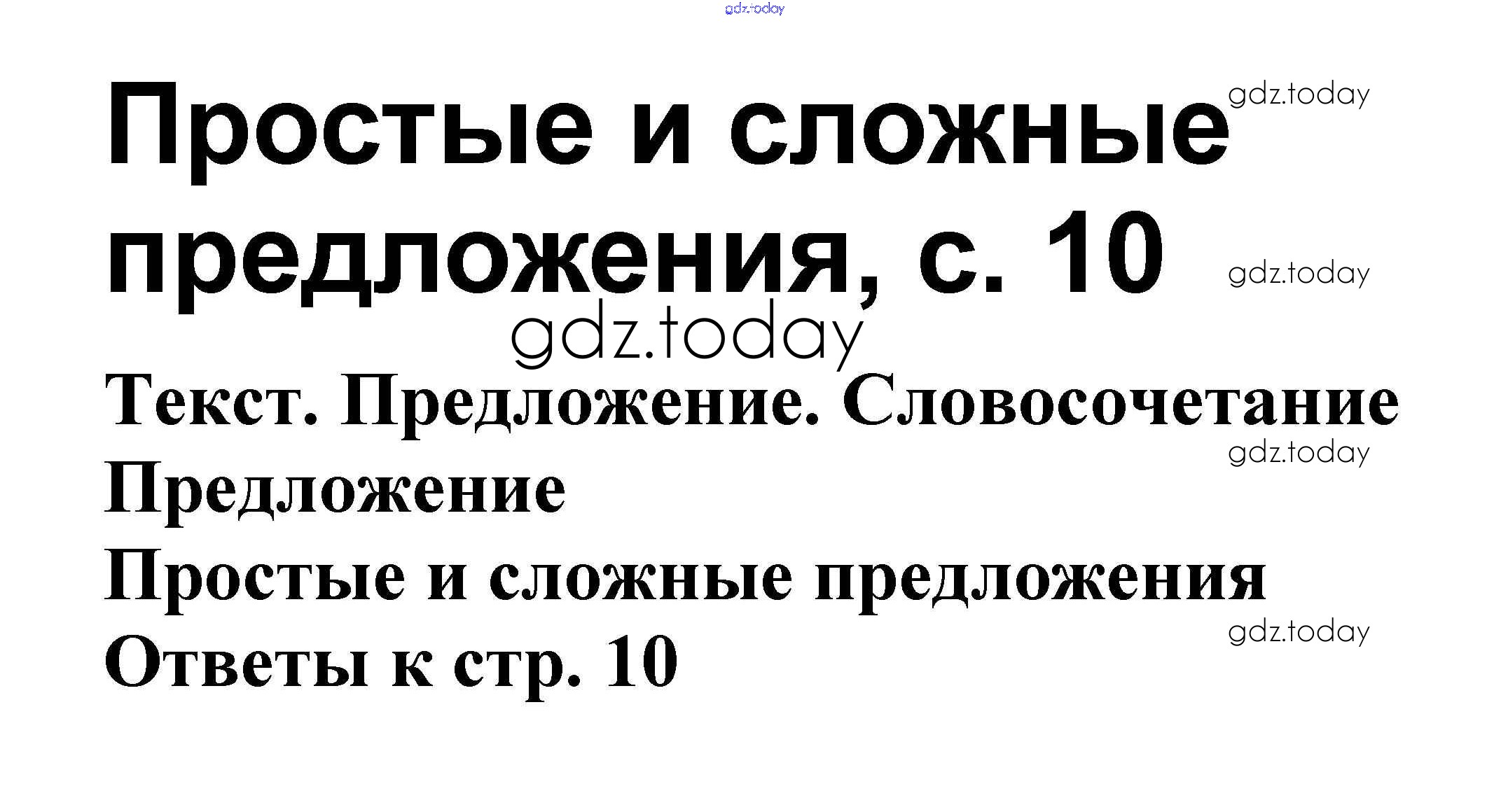 На страницах сайта gdz.today вы найдете учебный и вспомогательный материал, направленный на улучшения знаний школьной программы. ГДЗ - онлайн мир знаний Решение к теме "Текст. Предложение. Словосочетание" Простые и сложные предложения стр. 10 Проверочным работам по Русскому языку для 3 класса Канакина, Щеголева Просвещение Школа России 2018