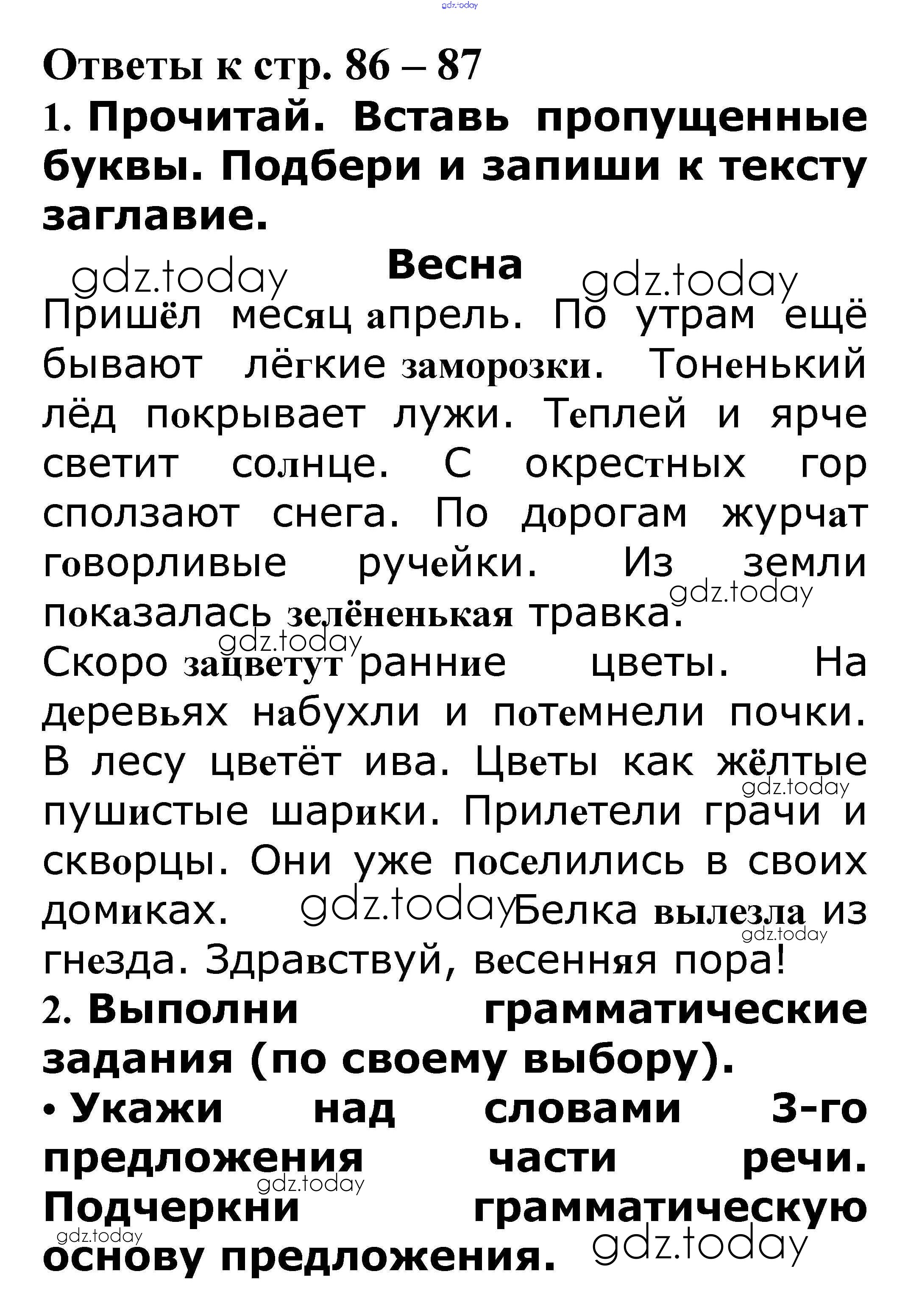 На страницах сайта gdz.today вы найдете учебный и вспомогательный материал, направленный на улучшения знаний школьной программы. ГДЗ - онлайн мир знаний Проверочная работ (за 2-е полугодие) стр. 86-87 Проверочным работам по Русскому языку для 3 класса Канакина, Щеголева Просвещение Школа России 2018