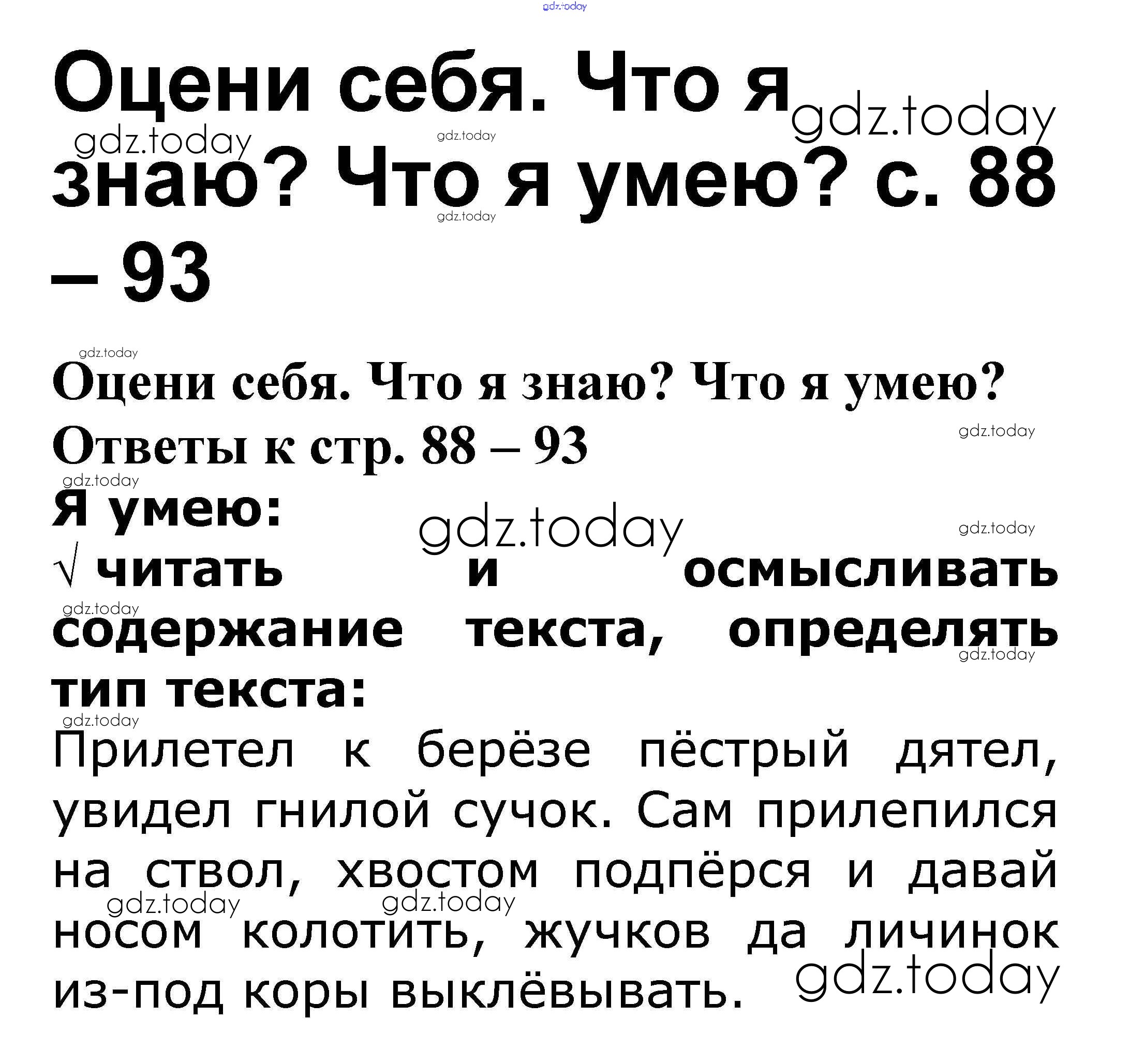 На страницах сайта gdz.today вы найдете учебный и вспомогательный материал, направленный на улучшения знаний школьной программы. ГДЗ - онлайн мир знаний Решение к теме "Оцени себя. Что я знаю? Что я умею?" стр. 88-93 Проверочным работам по Русскому языку для 3 класса Канакина, Щеголева Просвещение Школа России 2018