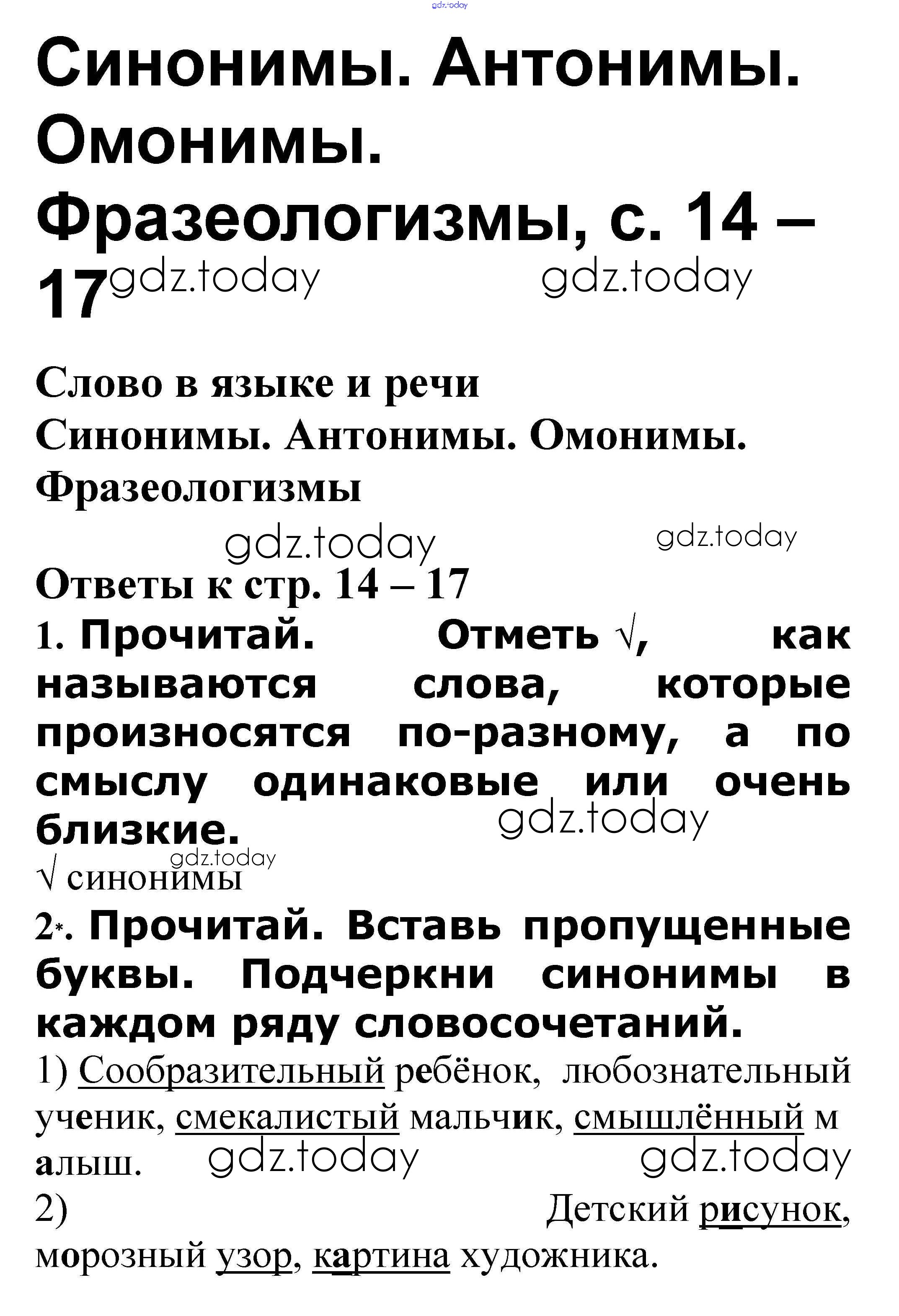 На страницах сайта gdz.today вы найдете учебный и вспомогательный материал, направленный на улучшения знаний школьной программы. ГДЗ - онлайн мир знаний Решение к теме "Слово в языке и речи" Синонимы. Антонимы. Омонимы. Фразеологизмы стр. 14 – 17 Проверочным работам по Русскому языку для 3 класса Канакина, Щеголева Просвещение Школа России 2018