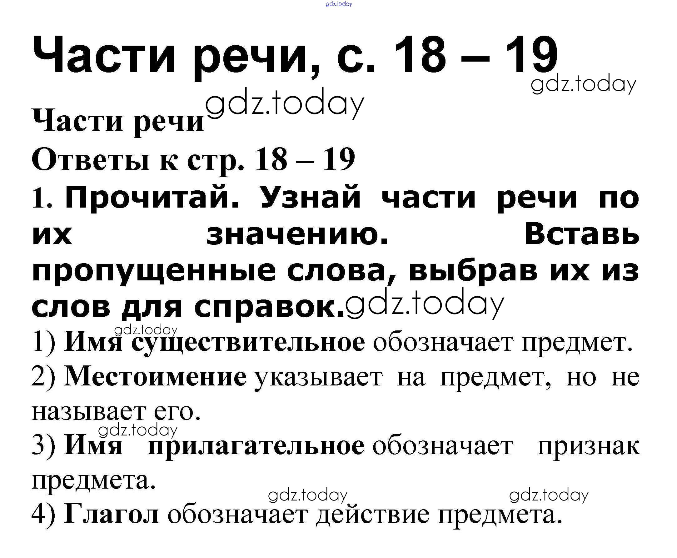 На страницах сайта gdz.today вы найдете учебный и вспомогательный материал, направленный на улучшения знаний школьной программы. ГДЗ - онлайн мир знаний Решение к теме "Слово в языке и речи" Части речи стр. 18 – 19 Проверочным работам по Русскому языку для 3 класса Канакина, Щеголева Просвещение Школа России 2018