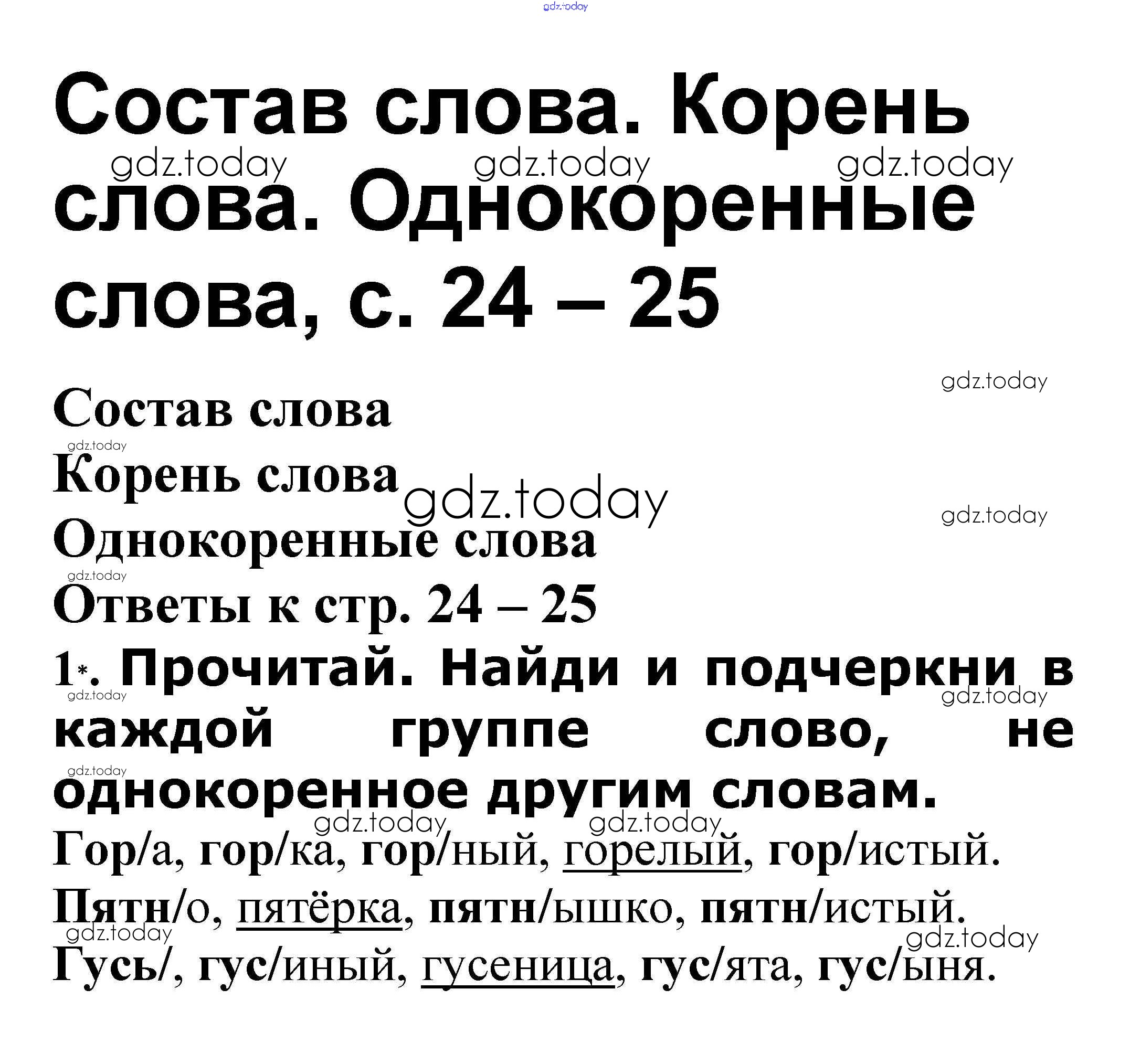 На страницах сайта gdz.today вы найдете учебный и вспомогательный материал, направленный на улучшения знаний школьной программы. ГДЗ - онлайн мир знаний Решение к теме "Состав слова" Корень слова. Однокоренные слова стр. 24 – 25 Проверочным работам по Русскому языку для 3 класса Канакина, Щеголева Просвещение Школа России 2018