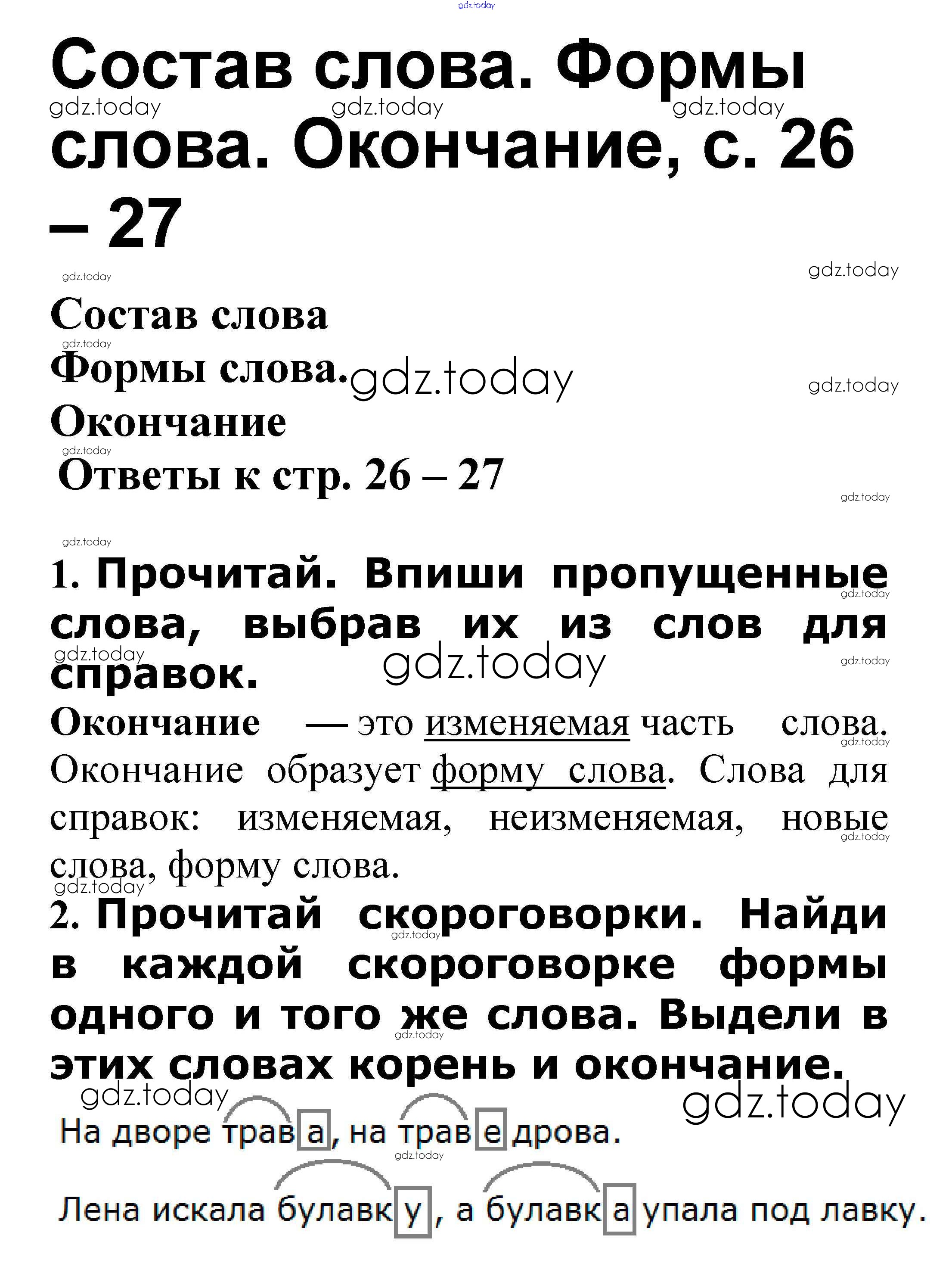 На страницах сайта gdz.today вы найдете учебный и вспомогательный материал, направленный на улучшения знаний школьной программы. ГДЗ - онлайн мир знаний Решение к теме "Состав слова" Формы слова. Окончание стр. 26 – 27 Проверочным работам по Русскому языку для 3 класса Канакина, Щеголева Просвещение Школа России 2018